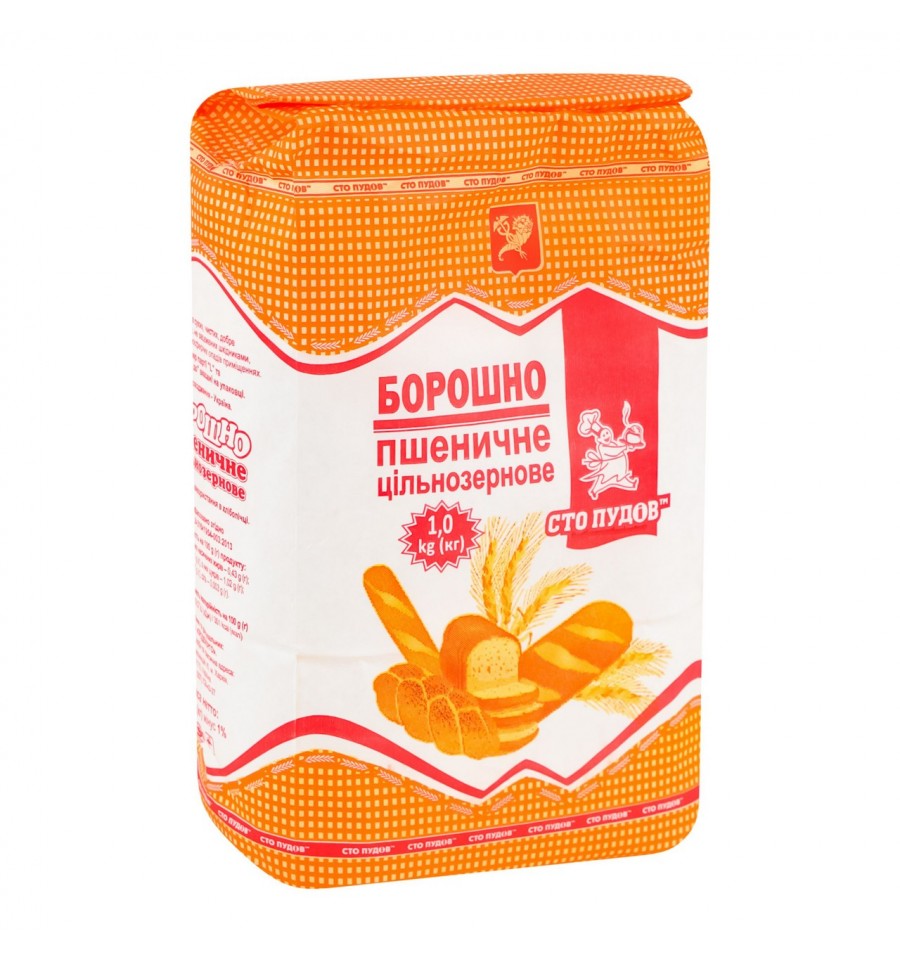 Мука цельнозерновая Сто Пудов 1кг. Состав: мука цельнозерновая 100%. Пищевая ценность в 100 г продукта: жиров – 2,1 g (г), из них насыщенных жиров – 0,43 g (г); углеводов – 77,1 g(г), из них сахаров – 1,02 g(г); белков – 5,7 g(г), соль – 0,003 g(г). Энергетическая ценность/калорийность на 100 g(г) продукта: 1469,57 kJ(кДж)/ 351 kcal(ккал). Срок годности: 12 мес. (на упаковке указана только Дата Применить к). Хранить в сухих, чистых, хорошо вентилируемых, не зараженных вредителями хлебных запасов помещениях. Номер партии L и дата Применить к указанным на упаковке. Производитель: ООО «ПРОДЭНЕРГО». Страна производства: Украина. Адрес юр. личности и фактический адрес мощностей (объекта) производства: ул. Гв. Широнинцев, 45, г. Харьков, 61170, Украина. Масса нетто: 1000 г