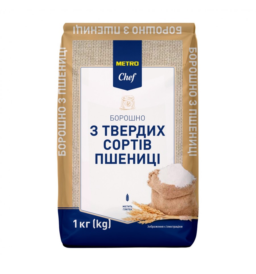 Мука Metro Chef из твердых сортов пшеницы 1кг. Состав: мука из твердых сортов ПШЕНИЦЫ (содержит ГЛЮТЕН). Аллергены: Глютен Энергетическая ценность на 100г продукта: 1396 кДж/334 ккал, Жиры – 1,3 г, Насыщенные жиры – 0,2 г, Углеводы – 70 г, Сахара – 1,0 г, Белки – 11 г, Соль – 0,1 г. Условия хранения: в сухих, чистых, хорошо проветриваемых помещениях, не зараженных вредителями хлебных запасов, складах с соблюдением санитарных норм и правил. Производитель: ООО Стар Гроссери. Производитель является оператором рынка пищевых товаров. Адрес мощностей оператора рынка: ул. Вокзальная, 1а, с. Шевченково, Великодимерская ТГ, Броварской р-н, Киевская обл., 07434, Украина. Изготовлено по заказу: ООО «Метро Кэш энд Кери Украина», просп. Григоренко, 43, г. Киев, 02140, Украина. По вопросам продукта обращайтесь по телефону горячей линии: 0 800 501 401 (бесплатно в пределах Украины). Страна: Украина. Масса нетто: 1000 г.