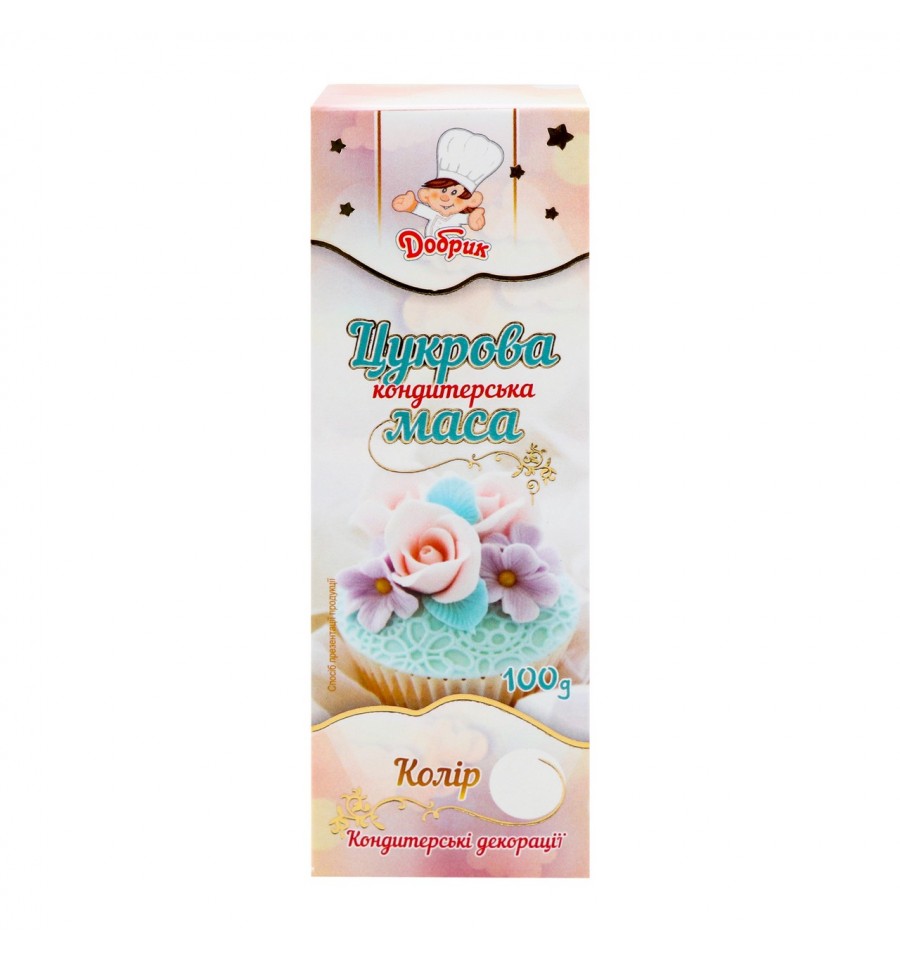 Масса сахарная Добрик кондитерский 100г. Состав: сахар, патока крахмальная, жир кондитерский, глюкоза кристаллическая, эмульгатор глицерин, загустители (камедь ксантан, крахмал кукурузный, Е466), консервант сорбиновая кислота, регулятор кислотности Е330, ароматизатор Земляника, краситель искусственный зависимо 1 Е102, красный – Е110, Е124, голубой – Е133, зеленый – Е102, Е133. Энергетическая ценность продукта: 1756кДж/100г, 417ккал/100г. Питательная (пищевая) ценность продукта: белки – 0.02г/100г, жиры – 5г/100г, насыщенные жиры – 1.3г/100г, углеводы – 93г/100г, из них сахара – 91г/100г, соль – 0.01г. Условия хранения: хранить при температуре не выше +25ºC и относительной влажности воздуха не более 75%. Без попадания прямых солнечных лучей. Срок годности: 2 года. Страна изготовитель: Украина. Производственные мощности и адрес производственных мощностей: Ровенский комбинат праздничных украшений, ул. Млиновская, 55Ж, с. Дядьковичи, Ровенский р-н, Ровенская обл., Украина, 35361. Масса нетто: 100г.