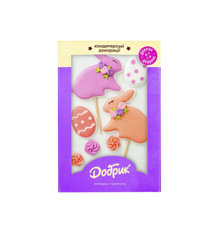 Набор кондитерских декораций Добрык Зайка с цветочками 1шт. Состав: сахар, патока крахмальная, глюкоза кристаллическая, масло пальмовое, крахмал кукурузный, загустители (Е466, камедь конжака и гуара, белок яичный сухой, модифицированный крахмал), регулятор кислотности Е330, консервант сорбинова в зависимости от цвета изделия: желтый – Е102, оранжевый – Е110, малиновый – Е122, розовый, красный – Е124, зеленый – Е102, Е133, голубой – Е133, коричневый – Е155, белый – Е171. Энергетическая ценность продукта: 1697кДж/100г, 399ккал/100г. Питательная (пищевая) ценность продукта: белки – 0.6г/100г, жиры – 1г/100г, насыщенные жиры – 0.8г/100г, углеводы – 96г/100г, соль – 0.01г/100г. Условия хранения: хранить при температуре не выше +25ºC и относительной влажности воздуха не более 75%. Без попадания прямых солнечных лучей. Срок годности: 3 года. Страна изготовитель: Украина. Производственные мощности и производственные мощности: ООО РКСП, ул. Петра Дорошенко, 84-В, г. Ровно, Украина, 33001. Количество: 7шт.
