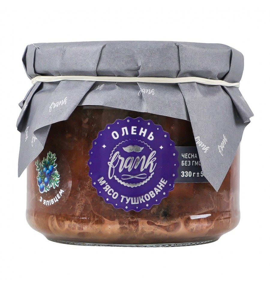 Мясо оленя Frank тушеное с можжевельником стерилизованное 330г. Состав: мясо оленя 86.5% (закладка сырья до стерилизации), можжевельник сушеный, соль поваренная, перец черный горошек, желатин пищевой, чабрец сушеный, розмарин сушеный, мускатный орех молотый. Без ГМО. Энергетическая ценность продукта: 615кДж/100г, 147ккал/100г. Питательная (пищевая) ценность продукта: белки – 18г/100г, жиры – 8.1г/100г, насыщенные жиры – 3.28г/100г, углеводы – 0.18г/100г, из них сахара – 0.06г/100г, соль – 0. Условия хранения: хранить при температуре 0..+20ºC и относительной влажности воздуха не более 75%. Хорошо вентилируемое место без попадания прямых солнечных лучей. Срок годности: 24 месяца. Страна изготовитель: Украина. Производитель и адрес производителя: ООО "Асагро", ул. Октябрьская, 24, с. Русанов, Киевская обл., Украина. Адрес производственных мощностей: ул. Октябрьская, 24, с. Русанов, Киевская обл., Украина. Масса нетто: 330г.