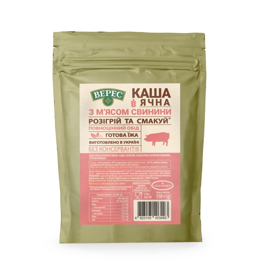Каша Верес ячневая с мясом свинины 350г. Состав: мясо свинины – 40%, вода питьевая, крупа ячменная ячневая – 15.5%, лук, морковь, модифицированный крахмал картофельный, соль поваренная. Может содержать следы: горчицы, сои, корня сельдерея, яичных продуктов, молочных продуктов. Энергетическая ценность на 100г продукта: 167 ккал/698 кДж, жиры – 8,7 г, насыщенные жиры – 3,2 г, углеводы – 13,6 г, сахара – 0,8 г, белки – 8,5 г, соль – 1,2 г. Срок годности Хранить при температуре от +1 ° С до +25 ° С и относительной влажности воздуха не более 75%. Оберегать от попадания прямых солнечных лучей. Производитель: ООО "Виджи Продакшн". Адрес производителя: ул. Грушевского, дом. 9Б, г.Киев, 01021, Украина. Тел.: (044) 424 05 55. Адрес мощностей производства: ул. Гетмана Михаила Дорошенко, дом. 1, г. Канев, Черкасский р-н, Черкасская обл., 19000, Украина. Страна: Украина. Масса нетто: 350 г.