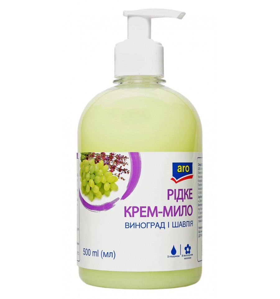 Крем-мыло Aro Виноград и шалфей жидкий с дозатором 500мл. Состав: вода, лауретсульфат натрия, кокамид ДЭА, кокамидопропилбетаин, ПЭГ-7 глицерил кокоат, экстракт винограда, экстракт шалфея, парфюмерная композиция, увлажняющее миндальное молочко, консервант (триэтиленгликоль, бензиллозин метилизотиазолинон), трилон Б, лимонная кислота, СО 19140, СО 16185, СО 42090, СО 73015. Условия хранения: хранить при температуре от 5°C до 25°C - 30 месяцев. Производитель: ООО ПКФ Биотон. Страна производства: Украина. Адрес производственных мощностей: ул. Войцеховича, 77, г. Днепр, 49101, Украина.