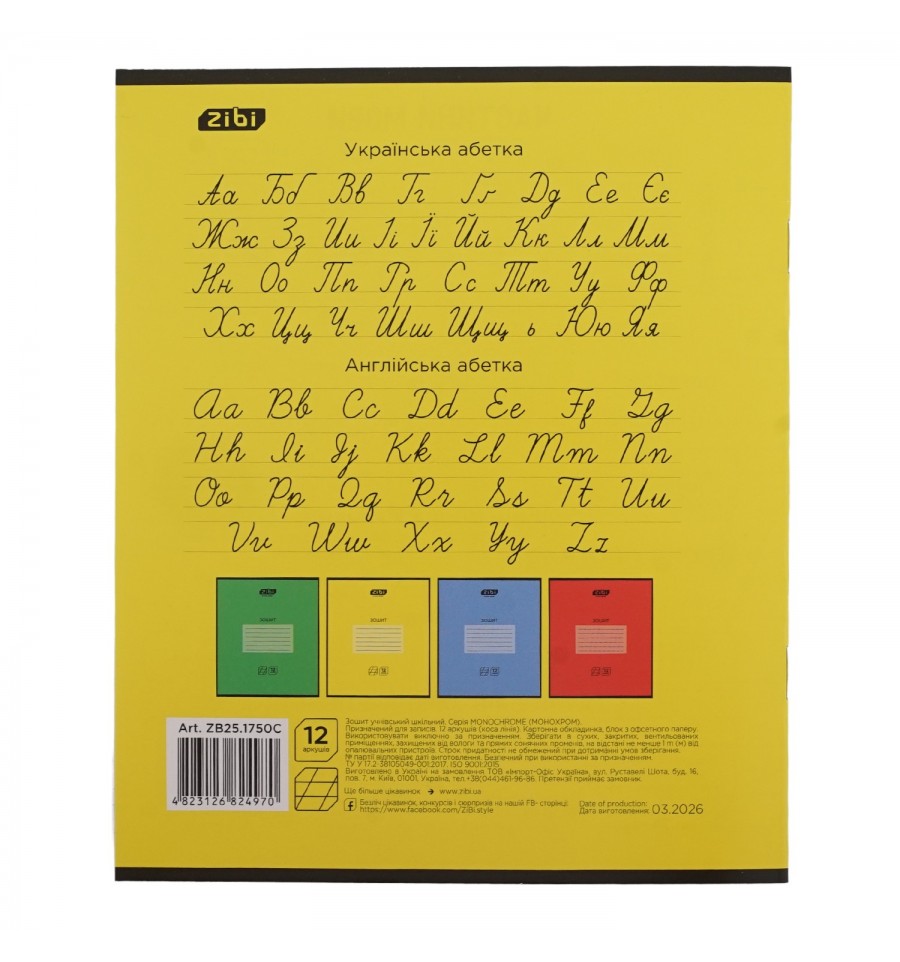 Тетрадь ученическая школьная серия Monochrome от ZiBi - имеет лаконичный дизайн в ярких цветах, отлично подходит для обучения в школе, выполнения классных, домашних и контрольных работ, черновики и т.д.12 листов Тетрадь в косу линию, печать голубым цветом, имеет красные поля Содержит вспомогательную линию Размер изделия 203х167 мм (стандартная тетрадь) Тип скрепления – скоба Внутренний блок – офсетная бумага плотностью 55 г/м², белье бумаги 98-100% Обложка выполнена из целлюлозного картона (плотностью 190 г/м²) с мелованным слоем и полноцветной печатью. На форзацах размещены справочные материалы по письму для младших классов НУШ Закругленные уголки листов и обложки обеспечат их чистоплотность в течение всего срока использования Имеет строчки для подписи на лицевой стороне обложки На задней стороне обложки размещены прописи украинского и английского алфавита Цвет обложки ассорти (зеленый, желтый, синий, красный) Групповая упаковка: 25 шт. в 4-х цветных дизайнах