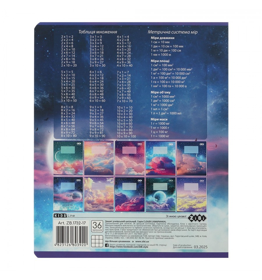 Тетрадь ученическая школьная серия "CLOUDS" по геометрии от ZiBi с креативным современным дизайном обложки и блоком полезной справочной информации прекрасно подходят для выполнения классных и домашних работ.36 листов тетрадь в клеточку размер изделия 203х167 мм тип скрепления – скоба внутренний блок: офсетная бумага плотностью 55 г/м² белье бумаги 98-100% поля красного цвета закругленные уголки, которые не заминаются обложка из целлюлозного картона плотностью 190 г/м² с мелованным слоем, полноцветной печатью и полиграфическими эффектами: выборочный УФ лак и тиснение серебряной голографической фольгой на внутренней стороне обложки, а также на первом и последнем дополнительном листе размещена справочная информация по предмету (всего 6 страниц формул, определений, понятий и правил по предмету).