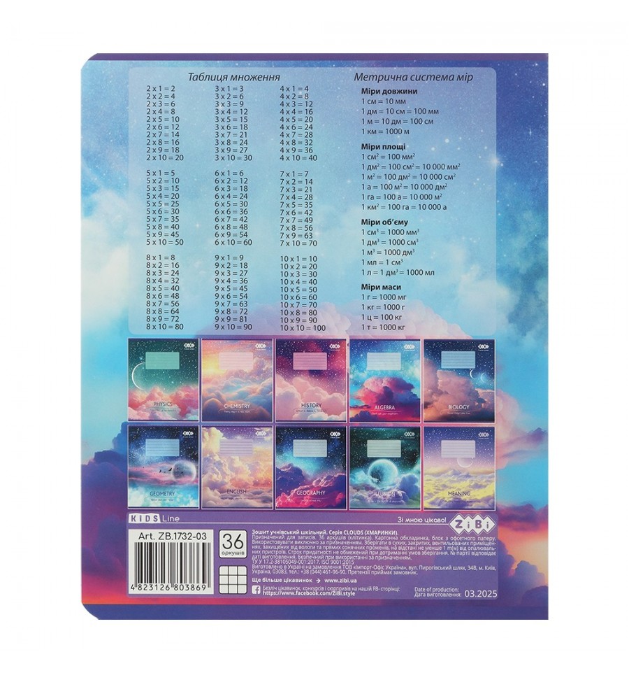 Тетрадь ученическая школьная серия "CLOUDS" из алгебры от ZiBi с креативным современным дизайном обложки и блоком полезной справочной информации прекрасно подходят для выполнения классных и домашних работ.36 листов тетрадь в клеточку размер изделия 203х167 мм тип скрепления – скоба внутренний блок: офсетная бумага плотностью 55 г/м² белье бумаги 98-100% поля красного цвета закругленные уголки, которые не заминаются обложка из целлюлозного картона плотностью 190 г/м² с мелованным слоем, полноцветной печатью и полиграфическими эффектами: выборочный УФ лак и тиснение серебряной голографической фольгой на внутренней стороне обложки, а также на первом и последнем дополнительном листе размещена справочная информация по предмету (всего 6 страниц формул, определений, понятий и правил по предмету).