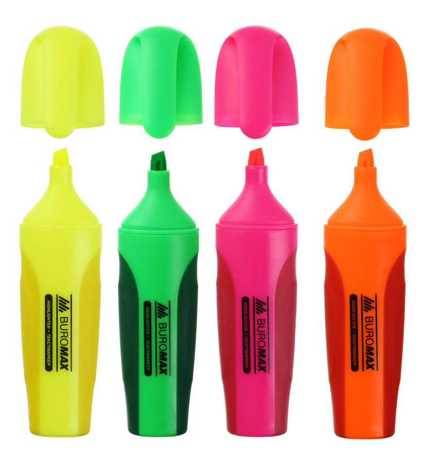 Высококачественные чернила текстовых маркеров BUROMAX специально разработаны для удобного и легкого выделения текста на разных видах бумаги. С помощью тестовых маркеров можно быстро выделить как рукописный текст на бумаге разной толщины, так и текст на факсовой бумаге, а также текст, напечатанный с помощью любых разновидностей принтеров и с помощью копировальных аппаратов. Чернила маркеров не размазывают выделяемый текст, оставляют след, позволяющий прочитать выделенный текст под цветным слоем маркера. Чернила не просачиваются даже через тонкие сорта бумаги. Износостойкий пишущий узел с гладким пористым клинообразным наконечником обеспечивает насыщенную и четкую линию письма толщиной от 1 до 4 мм, которая может варьироваться в зависимости от наклона маркера. Надписи легко и плавно ложатся на бумагу, что делает процесс использование маркера BUROMAX максимально комфортным. Удобству использования также способствуют резиновые вставки, размещенные по бокам корпуса. Пишущий узел и наконечник выдерживают высокие показатели давления и нажима без потери функциональных свойств. Корпус из первичного PP (полипропилена) не пропускает воздух к стержню, не допускает его быстрое высыхание и обеспечивает возможность длительного хранения и использования маркера. Благодаря чернилам на водной основе, следы от маркера легко смываются практически со всех видов тканей, а также различных поверхностей. Отсутствие химического запах вместе с безопасной водной основой делает процесс использования текстового маркера BUROMAX комфортным и подходящим для обучения, профессиональных и бытовых нужд. В набор текстовых маркеров BM.8906-94 входят маркеры желтого, зеленого, розового и оранжевого цветов. Упаковка: PVC- пенал с европодвесом.