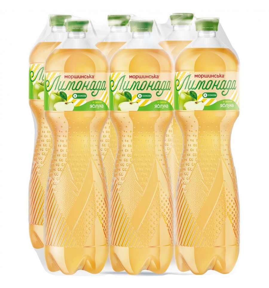 Напиток безалкогольный Моршинская Лимонада сокосодержащая среднегазированная со вкусом яблока 1.5л. Состав: вода природная минеральная Моршинская 82%, сироп глюкозно-фруктозный, яблочный сок восстановленный из концентрированного сока 5%, кислота: лимонная кислота, сок яблочный концентрированный карамельный, натуральный ароматизатор. Энергетическая ценность продукта: 169кДж/100мл, 40ккал/100мл. Питательная (пищевая) ценность продукта: белки – 0г/100мл, жиры – 0г/100мл, насыщенные жиры – 0г/100мл, углеводы – 9.9г/100мл, из них сахара – 9.6г/100мл, соль – 0г/. Условия хранения: хранить при температуре +5…25ºC. Без попадания прямых солнечных лучей. Срок годности: 9 месяцев. Страна изготовитель: Украина. Производственные мощности и адрес производственных мощностей: ЧАО Моршинский завод минеральных вод Оскар, ул. Геологов, 12а, г. Моршин, Львовская обл., Украина, 82482. Объем: 1.5л.