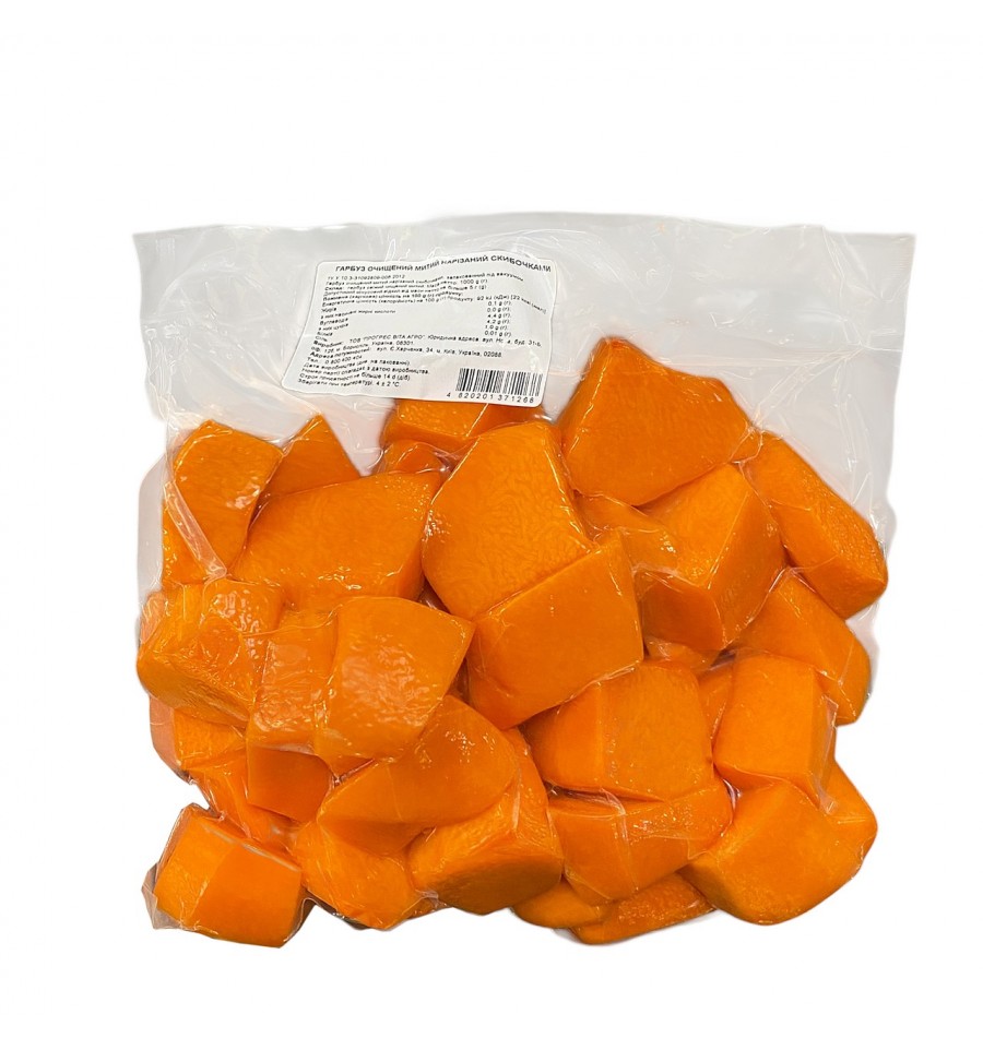 Тыква очищенная мытая нарезанная ломтиками, упакованная под вакуумом. Состав: тыква свежая чистая мытая. Масса нетто: 1000 г (г). Допустимый минусовый отклон от массы нетто не более 5 g(г). Питательная (пищевая) ценность на 100 g(г) продукта: белки – 1,0 g(г); жиры – 0,1 g (г), из них насыщенные жирные кислоты – 0,0 g (г); углеводы – 4,4 g (г), из них сахара – 4,2 g (г); соль – 0,01 g(г). Энергетическая ценность (калорийность) на 100 g(г) продукта: 92 kJ(кДж)/22 kcal(ккал). Дата производства (см. на упаковке). Номер партии совпадает с датой производства. Хранить при температуре: (4±2)°С. Срок годности не более 14 d (сут). Производитель: ООО "ПРОГРЕСС ВИТА АГРО". Юридический адрес: ул. Новая, дом. 31-Б, оф. 126, г. Борисполь, 08301, Украина. Адрес мощностей: ул. Е. Харченко, 34, г. Киев, 02088 Украина.