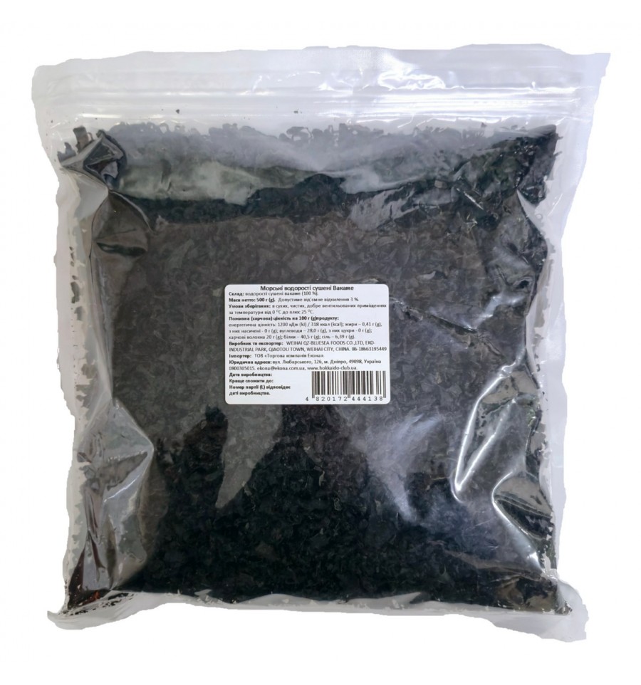 Сушеные водоросли вакаме – это полезный продукт с нежным вкусом и легким ароматом моря. Они богаты йодом, кальцием, магнием, витаминами A, C, K и антиоксидантами. Вакаме широко используются в азиатской кухне: добавляются к супам, салатам, гарнирам и роллам. Перед употреблением рекомендуется замочить в воде, после чего они увеличиваются в объеме и становятся мягкими. Состав: Водоросли морские сушеные вакаме 100%. Калорийность в 100г продукта, ккал/кДж – 138. Пищевая (питательная) ценность в 100г продукта: Белки, г. – 1,1 Жиры, г. – 4 Углеводы, г. – 41,8. Условия хранения: хранить при температуре от 0 до +25°C. Срок годности, дней – 730. Хранить в сухом месте. Производитель: ООО ТК Экон. Страна происхождения: Китай Адрес производственных мощностей: ул. Любарского, 126, г. Днепр, Днепропетровская обл., 49034. Масса нетто: 500 г