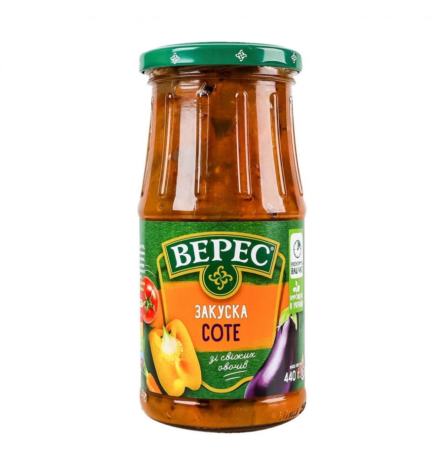 Закуска Верес Соте стерилизована 440г. Состав: баклажаны (45%), перец сладкий (19%), томаты (15%), морковь (7%), подсолнечное масло рафинированное дезодорированное, сахар, вода питьевая, соль поваренная, модифицированный крахмал кукурузный, чеснок (0,6%), регулятор (0,6%), регулятор. Энергетическая ценность продукта: 372кДж/100г, 89ккал/100г. Питательная (пищевая) ценность продукта: белки – 0.9г/100г, жиры – 5г/100г, насыщенные жиры – 0.6г/100г, углеводы – 10г/100г, из них сахара – 7.4г/100г, соль – 1.3г. Условия хранения: хранить при температуре 0..+25ºC и относительной влажности воздуха не более 75%. Без попадания прямых солнечных лучей. Срок годности: 2 года. Страна изготовитель: Украина. Производитель и адрес производителя: ООО Виджи Продакшн, ул. Гетмана Михаила Дорошенко, дом. 1, г. Канев, Черкасский р-н, Черкасская обл., Украина, 19000. Адрес производственных мощностей: ул. Гетмана Михаила Дорошенко, дом. 1, г. Канев, Черкасский р-н, Черкасская обл., Украина, 19000. Масса нетто: 440г.