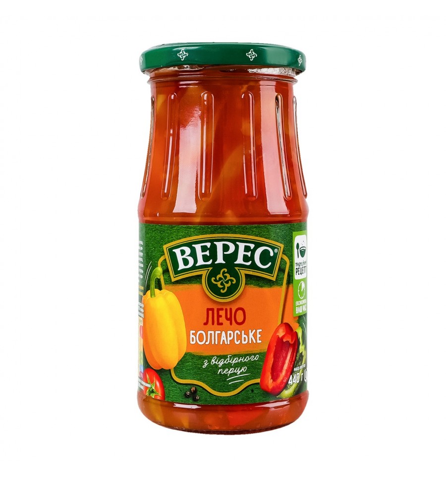 Лечо Верес болгарское стерилизованное 440г. Состав: перец сладкий (40%), вода питьевая, томатная паста (7%), сахар, соль поваренная, модифицированные крахмалы: картофельный, кукурузный, регулятор кислотности уксусная кислота, стабилизаторы: гуаровая камедь, ксантановый камедь, перец, перец молотый, корица молотая, орех мускатный молотый. Энергетическая ценность продукта: 185кДж/100г, 44ккал/100г. Питательная (пищевая) ценность продукта: белки – 0.7г/100г, жиры – 0г/100г, насыщенные жиры – 0г/100г, углеводы – 10г/100г, из них сахара – 8г/100г, соль – 1.4г/100г. Условия хранения: хранить при температуре 0..+25ºC и относительной влажности воздуха не более 75%. Без попадания прямых солнечных лучей. Срок годности: 2 года. Страна изготовитель: Украина. Производитель и адрес производителя: ООО Виджи Продакшн, ул. Гетмана Михаила Дорошенко, дом. 1, г. Канев, Черкасский р-н, Черкасская обл., Украина, 19000. Адрес производственных мощностей: ул. Чигиринская, дом. 13/9, г. Черкассы, Украина, 18030; ул. Гетмана Михаила Дорошенко, дом. 1, г. Канев, Черкасский р-н, Черкасская обл., Украина, 19000. Масса нетто: 440г.