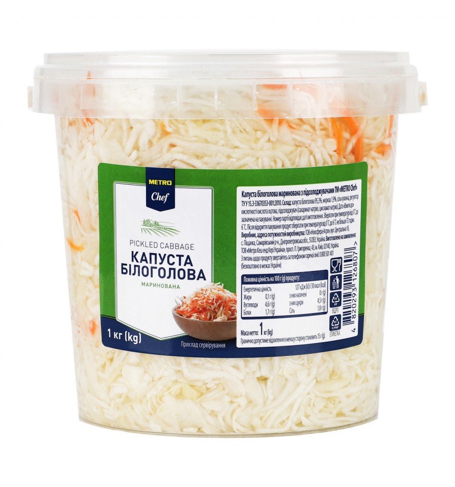 Капуста Metro Chef белокочанная маринованная с подсластителями 1кг. ТУ У 15.3-33670353-001:2010. Состав: капуста белокочанная 95,3%, морковь 1,9%, соль поваренная, регулятор кислотности кислота уксусная, подсластитель (сахаринат натрия, цикламат натрия).. . Энергетическая ценность на 100г продукта: 127 кДж/ 30 ккал, жиры - 0,1г, насыщенные жиры - 0г, углеводы - 4,6г, сахара - 4,5г, белки 1,7г, соль - 1,8г. Номер партии товара соответствует дате изготовления. Хранить при температуре от 0℃ до +6℃. После открытия упаковки продукт хранить при температуре от 0 до 6 ˚С не более 72 часов. Производитель: ООО "Ноосфера-Агро". Изготовлено по заказу: ООО «Метро Кэш энд Кери Украина», просп. Григоренко, 43, г. Киев, 02140, Украина. Тел.: 0 800 501 407. Адрес мощностей производства: ул.Центральная 16, с.Песчанка, Самаровский р-н., Днепропетровская обл., 51283, Украина. Страна: Украина. Масса нетто: 1000 г(g). Предельно допустимое отклонение в меньшую сторону 15г (g).