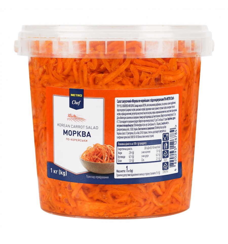 Морковь Metro Chef по-корейски с подсластителем 1кг. ТУ У 15.3-33670353-001:2010. Состав: морковь 90,9%, масло подсолнечное рафинированное, соль поваренная, чеснок измельченный, подсластитель (сахаринат натрия, цикламат натрия), усилитель вкуса глутамат натрия, консервант бензоат натрия, кориандр молотый, регулятор кислотности молотый.. . Энергетическая ценность на 100г продукта: 263 кДж/63 ккал, жиры - 2,9г, насыщенные жиры - 1,3г, углеводы - 6,7г, сахара - 6,2г, белки 1,3г, соль - 2,1г. Номер партии товара соответствует дате изготовления. Хранить при температуре от 0℃ до +6℃. После открытия упаковки продукт хранить при температуре от 0 до 6 ˚С не более 72 часов. Производитель: ООО "Ноосфера-Агро". Изготовлено по заказу: ООО «Метро Кэш энд Кери Украина», просп. Григоренко, 43, г. Киев, 02140, Украина. Тел.: 0 800 501 405. Адрес мощностей производства: ул.Центральная 16, с.Песчанка, Самаровский р-н., Днепропетровская обл., 51283, Украина. Страна: Украина. Масса нетто: 1000 г(g). Предельно допустимое отклонение в меньшую сторону 15г (g).