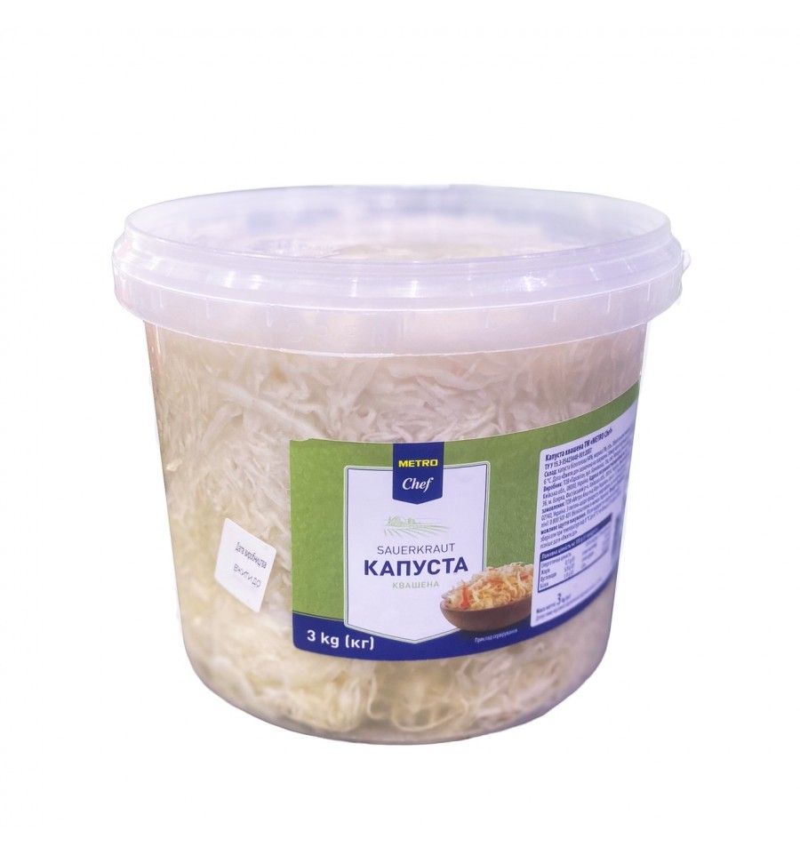 Капуста Metro Chef квашеная 3кг. ТУ У 15.3-35423448-001:2007. Состав: капуста белокочанная 94%, морковь 3%, соль. Энергетическая ценность (калорийность) 100 г продукта - 133 кДж /31 ккал., жиры— 0,1 г,, насыщенные жиры-0 г, углеводы- 5,8 г, сахара-3,2 г, белки 1,8 г, соль 3,0г. Номер партии идентифицируется по дате применить. Хранить при температуре от +0С до +6℃.После открытия упаковки продукт хранить при температуре от +0°С до +6℃ не более 72 часов. Производитель: ООО "Таровита". Адрес производителя: 08000, Украина, Киевская обл., Бучанский р-н, пгт Макаров, ул. Банковская, 15а. Адрес мощностей производства: 08150, Украина, Киевская обл., Фастовский р-н, г. Боярка, ул. Соборности, 36. Тел. +38 067 232 47 78. Страна: Украина. Масса нетто: 3000 г (g). Допустимый минусовый отклон от массы нетто не более 1,5 %.