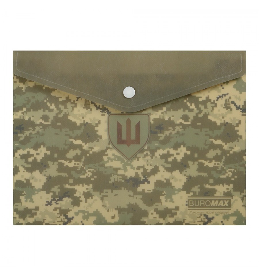 Папка конверт на кнопке серии MILITARY от BUROMAX подходит для систематизации, хранения и транспортировки документов. Папка выполнена в актуальном дизайне пиксель, сдержана, не марка. Такая папка подойдет для транспортировки и хранения бумаг, учебных материалов, пособий и многое другое. Папка пригодится сотрудникам различных сфер деятельности, как гражданских так и военных, а также студентам и школьникам, защитит содержимое от смятия, намокания или загрязнения.для бумаг формата А5 (размер 180х240 мм) материал: матовый полупрозрачный пластик толщиной 180 мкм закрывается клапаном с помощью пластиковой кнопки, что обеспечивает надежную сохранность бумаг и легкий доступ к ним. емкость до 150 листов основной цвет: зеленый В нашем ассортименте Вы найдете другие канцелярские товары серии MILITARY.