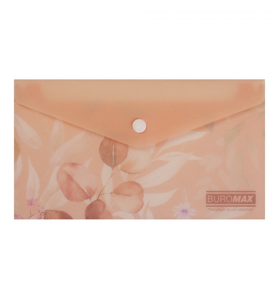 Папка конверт евроформата DL на кнопке серии ARABESKI от BUROMAX подходит для хранения и транспортировки документов, имеет удобный формат для путешествий. Папка выполнена в нежном цветочном дизайне, что непременно будет привлекать и вдохновлять! Папка лучше всего пригодится сотрудникам туристических и рекламных агентств и компаний, гидам и маркетологам и многим другим потребителям, защитит содержимое от смятия, намокания или загрязнения.для бумаг формата DL (размер 225х125 мм) материал: матовый полупрозрачный пластик толщиной 180 мкм закрывается клапаном с помощью пластиковой кнопки, что обеспечивает надежную сохранность бумаг и легкий доступ к ним. может использоваться как пенал, для хранения мелких канцелярских принадлежностей основной цвет: персиковый Купите другие канцтовары серии ARABESKI, с цветочными и пастельными дизайнами и соберите собственную уникальную коллекцию, которая обязательно подчеркнет Ваш стиль и вкус и обязательно будет радовать взгляд!