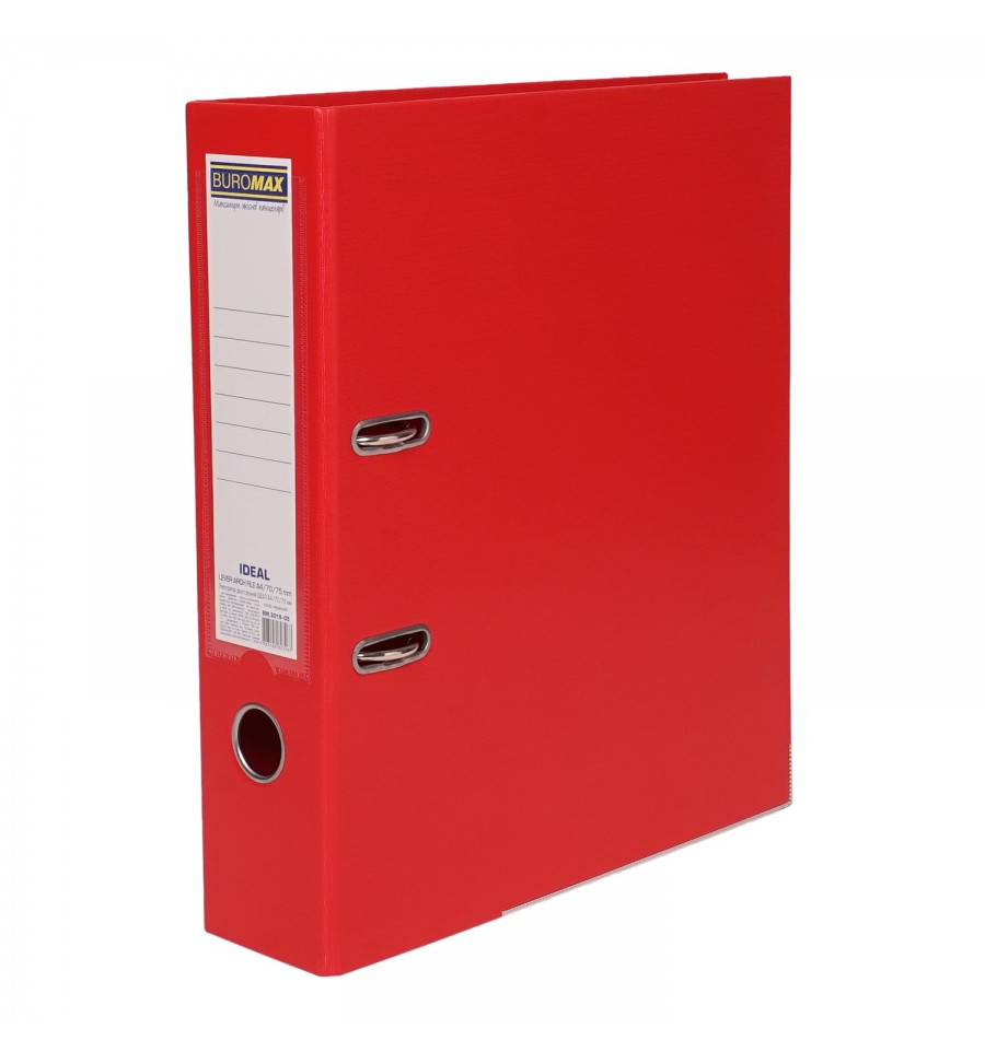 Регистратор двухсторонний IDEAL от BUROMAX – для хранения и архивации документов в деловых и офисных процессах. Может использоваться офисами, архивными службами, учебными и коммерческими учреждениями, где требуется систематизация и хранение документации.• Сменный двусторонний индекс на корне для подписи • Кольцо на корне для удобного захвата пальцами • Замки фиксации закрытого положения • Двухстороннее полипропиленовое покрытие защищает обложку и содержимое от влаги и механических повреждений. • Металлический протектор нижнего края обложкиТехнические характеристики• Формат – А4 • Ширина корешка рабочая (внутренняя) – 70 мм, ширина габаритная (наружная) – 75 мм.• Емкость – до 450 листов стандартной плотности 80 г/м² • Цвет – красный • Серия – IDEAL • Тип механизма – рычажный механизм с прижимом • Тип обложки – двусторонняя • Плотность картона обложки – 1500 г/м²Состав картон, полипропиленовая пленка, металлические детали.