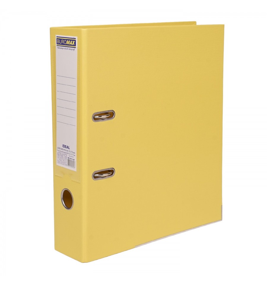Регистратор двухсторонний IDEAL от BUROMAX – для хранения и архивации документов в деловых и офисных процессах. Может использоваться офисами, архивными службами, учебными и коммерческими учреждениями, где требуется систематизация и хранение документации.• Сменный двусторонний индекс на корне для подписи • Кольцо на корне для удобного захвата пальцами • Замки фиксации закрытого положения • Двухстороннее полипропиленовое покрытие защищает обложку и содержимое от влаги и механических повреждений. • Металлический протектор нижнего края обложкиТехнические характеристики• Формат – А4 • Ширина корешка рабочая (внутренняя) – 70 мм, ширина габаритная (наружная) – 75 мм.• Емкость – до 450 листов стандартной плотности 80 г/м² • Цвет – желтый • Серия – IDEAL • Тип механизма – рычажный механизм с прижимом • Тип обложки – двусторонняя • Плотность картона обложки – 1500 г/м²Состав картон, полипропиленовая пленка, металлические детали.