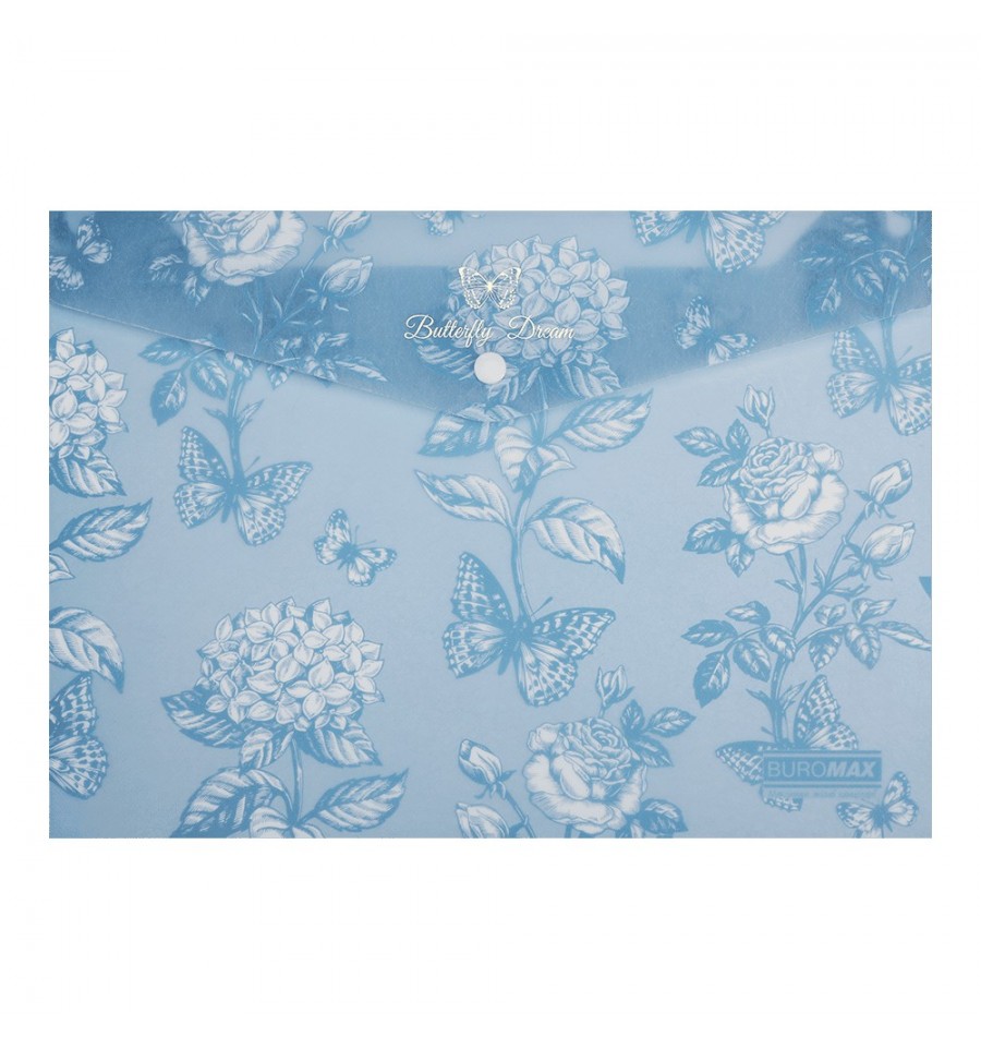 Папка-конверт на кнопке серии ARABESKI от BUROMAX – для систематизации, хранения и транспортировки документов. Может использоваться сотрудниками офисов и бизнес центров, финансовых учреждений, а также студентами и школьниками.• Изготовлен из матового полупрозрачного пластика в оригинальном цветочном дизайне с золотым фольгированием. • Закрывается клапаном на пластиковую кнопку, что обеспечивает надежную сохранность документов и легкий доступ к ним. • Подходит для хранения документов формата А4, защищая их от смыкания, намокания и загрязненияТехнические характеристики Формат – А4 (размер 235x330 мм) Толщина материала – 180 мкм Емкость – до 150 листов Цвет – сине-серыйСостав Пластик