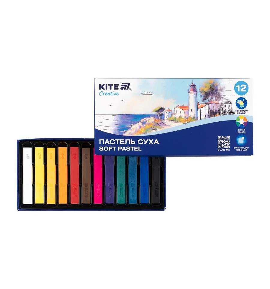Сухая пастель Kite K-201-12 Creative, 12 цветов – незаменимый художественный инструмент для тех, кто хочет совершенствовать свое мастерство, экспериментировать с техниками и передавать на бумаге эмоции и настроение.Пастель сочетает в себе качественные пигменты, мягкое нанесение и широкий спектр художественных возможностей. Она отлично подходит для школьников и студентов, углубляющих свои навыки, а также всех, кто любит заниматься творчеством.Сухая пастель Kite хорошо держится на поверхности, позволяет создавать как легкие прозрачные слои, так и плотные, глубокие тени. Она используется для создания портретов, пейзажей, иллюстраций, а также для работы в смешанных техниках. Благодаря безупречной структуре материала, она идеальна для техник растушевки, насыщенной штриховки и наложения цветов один на один. Пастель легко смешивается прямо на листе, позволяя получить десятки новых оттенков и тонких цветовых переходов.Kite Creative – серия канцелярии, которая пробуждает художника в каждом.Это товары для творческих хобби, раскрывающих таланты. Они доставят радость и удовольствие как детям, так и взрослым. Вдохновляйтесь и творите вместе с нами!На товарах серии размещен QR-код, по которому можно найти множество интересных идей и креативных мастер-классов от Kite.Особенности:12 насыщенных цветов – богатая палитра для творческих экспериментов; квадратная, 10*10 мм; длина 67 мм; высококачественные пигменты – яркие, однородные; равномерное мягкое нанесение – пастель легко ложится на поверхность; легкое смешивание и наслоение – для создания новых оттенков, эффекта воздушности или глубины; возможность растушевки – для плавных градиентов, светотени, атмосферы; разные типы поверхностей – бумага, картон, акварельная бумага, полотно, дерево; Комфортный формат брусков – удобно работать как тонкими, так и широкими штрихами.