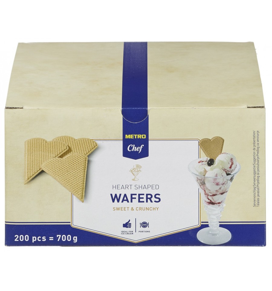 Вафли в форме сердец ТМ "METRO Chef". Состав: пшеничная мука, сахар, пшеничный крахмал, кокосовый жир, эмульгатор: соевый лецитин; ароматизатор, соль, разрыхлитель: карбонат натрия. Может содержать следы орехов. Энергетическая ценность на 100 г: 1793 кДж/424 ккал, жиры – 5,5 г, из них насыщены – 4,1 г, углеводы – 85 г, из них сахара – 37 г, белки – 7,3 г, соль – 0,34 г. Условия хранения: хранить Дата «Лучше потребить до» указана на упаковке. Номер партии соответствует дате «Лучше потребить до». Страна происхождения Германия. Производитель: Stenger Waffeln GmbH, Nikolaus-Otto-Str. 12, 56727 Mayen, Германия. Импортер: ООО "МЕТРО Кэш энд Керри Украина", просп. Григоренко, 43, г. Киев, 02140, Украина. По вопросам продукта обращайтесь по тел. горячей линии импортера: 0800 501 401 (бесплатно в пределах Украины). Масса нетто: 200 шт. = 700 г.