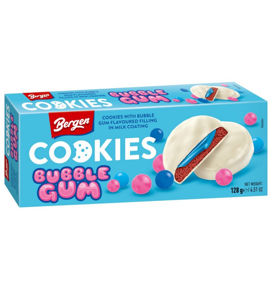 Печенье с молочно-сливочной начинкой со вкусом жевательной резинки покрыто молочной глазурью Bergen. Состав: молочная глазурь 27% [сахар, жиры растительные (масло пальмовое, масло пальмоядровое), МОЛОКО цельное сухое 4,1%, МОЛОКО обезжиренное сухое 1,8%, эмульгатор: лецитины (СОЯ), ароматизаторы) (начинка молочно-сливочное масло 25%) рапсовая), сухая сыворотка (из МОЛОКА), МОЛОКО сухое обезжиренное 1,8%, ароматизатор, краситель: спирулина], жиры растительные (масло кокосовое, масло рапсовое), разрыхлитель: карбонат натрия; краситель: мальтодекстрин; краситель: карминовая кислота Е120 0,0094%]. 59 г, из них сахара - 42 г; пищевые волокна - 3,7 г; соль - 0,62 г. просп. П. Григоренко, 43, г. Киев, 02140, Украина, по вопросам продукта обращайтесь по тел.