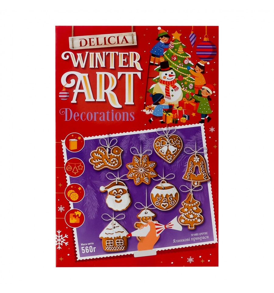 Печенье Delicia Елочные сахарные украшения 560г. Состав: печенье сахарное (мука пшеничная, пудра сахарная, жир растительный (пальмовое масло негидрогенизированная), глюкозно-фруктозный сироп, смесь специй (корица, кориандр, какао-порошок, гвоздика, имбирь, черный перец, кардамон, душистый перец), разрыхлитель) Энергетическая ценность продукта: 1776кДж/100г, 421ккал/100г. Питательная (пищевая) ценность продукта: белки – 4.4г/100г, жиры – 7.9г/100г, насыщенные жиры – 3.7г/100г, углеводы – 82г/100г, из них сахара – 53.9г/100г, соль – 0. Рекомендуемый способ приготовления/употребления: для приготовления белковой массы необходимо дополнительно одно свежее яйцо. 1. Отделить белок от желтка. 2. Взбить белок миксером в течение 5-7 минут. в густую пену до образования жестких пиков. 3. К пене добавить сахарную пудру и осторожно перемешать ложкой. 4. Получившуюся белковую массу поместить в кондитерский мешок и разрисовать печенье. 5. Разрезать шпагат на равные части (15-18см) и соединить его с фигурками через отверстие в печенье. Повести готовые украшения на новогоднюю елку. Условия хранения: хранить при температуре +13..+23ºC и относительной влажности воздуха не более 75%. Срок годности: 1 год. Страна изготовитель: Украина. Производственные мощности и адрес производственных мощностей: ЧП Делиция, ул. Заводская, 2-В, г. Буча, Киевская обл., Украина, 08292. Количество: 22шт. Масса нетто: 560г.