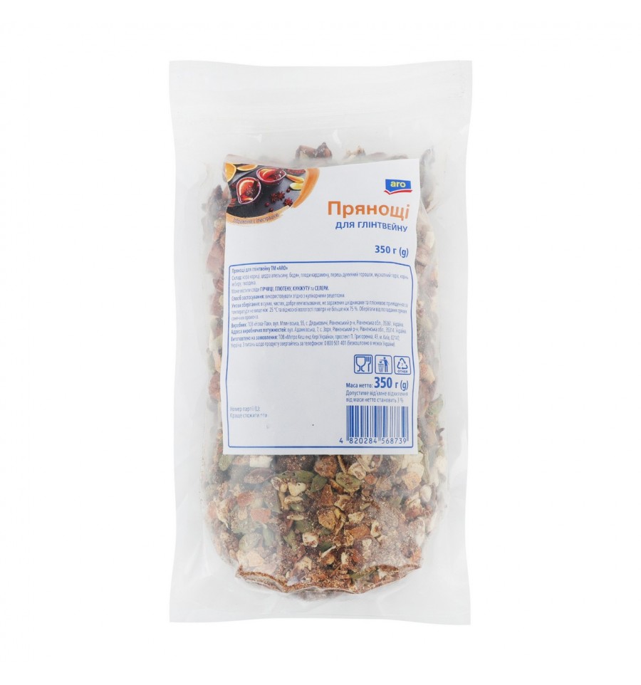 Состав: кора корицы, цедра апельсина, бодян, плоды кардамона, перец душистый горошек, мускатный орех и корень имбиря, гвоздика. Может содержать следы сельдерея, горчицы, муки пшеничной (глютен), кунжута. Условия хранения: в сухих, чистых, хорошо вентилируемых, не зараженных вредителями и плесенью помещениях, при температуре не выше плюс 25 °С и относительной влажности воздуха не более 75 %. Оберегать от попадания прямых солнечных лучей. Производитель: ООО "Нова-Пак", ул. Млиновская, 55, с. Дядьковичи, Ровенский р-н, Ровенская обл., 35361, Украина, тел.: (0800) 300 627. Масса нетто: 350 г