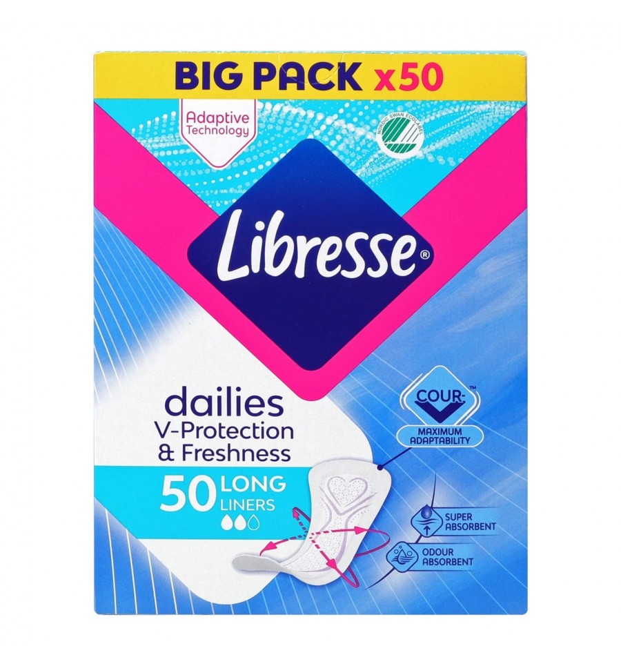 Выделение – это нормально. Они свидетельствуют о том, что твоя интимная зона работает как надо. Наши ежедневные прокладки Libresse Dailies protect впитывают незначительные выделения, сохраняя кожу и белье сухими. Благодаря дышащей поверхности, прокладка позволяет коже дышать. А специальная гибкая форма Cour-V плотно прилегает к твоему телу. Пакет изготовлен на 100% из возобновляемых волокон. Cour-V™ - специальная гибкая, тесно прилегающая форма. Дышащие. Впитывающий слой для ежедневной защиты. 100% пакет из возобновляемых волокон. Состав: целлюлозные волокна, полиэстер, полипропилен, полиэтилен, суперабсорбенты, прочие полимеры, синтетическая смола, карбонат кальция, молочная кислота. Длина*Толщина: 175*0,5 мм. Поглощение: 2 капли. Количество в упаковке: 50 шт. Форма: без крылышек. Ароматизация: без аромата. Страна производитель: Словакия. Производитель: Essity. Производственные мощности: Essity Slovakia s.r.o., Гемерская Горка 400, Словакия, СК-04912. Срок годности: 3 года. Условия хранения: в сухом месте, не требует особого температурного режима. Пользуйся Libressе и чувствуй максимальную защиту и комфорт.