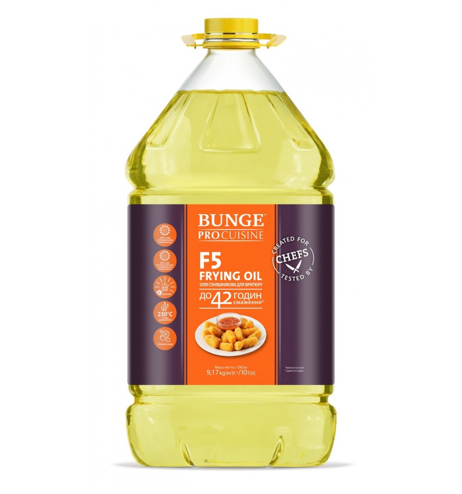 Масло подсолнечное Bunge ProCuisine F5 рафинированное для фритюра 10л. Состав: масло подсолнечное рафинированное дезодорированное вымороженное марки П – 50%, масло подсолнечное высокоолеиновое рафинированное дезодорированное вымороженное – 50%, пеногаситель Е900 – менее 0.001%. Без ГМО. Энергетическая ценность продукта: 3700кДж/100г, 900ккал/100г. Питательная (пищевая) ценность продукта: белки – 0г/100г, жиры – 99.9г/100г, насыщенные жиры – 9.5г/100г, углеводы – 0г/100г, из них сахара – 0г/100г, соль – 0г/100г. Условия хранения хранить при температуре 0..+30ºC. Хранить в закрытом, затемненном помещении. Срок годности: 24 месяца. Температура хранения после открытия продукта: хранить при температуре 0..+11ºC. Срок годности после вскрытия продукта: 100 дней. Страна изготовитель: Украина. Производственные мощности и адрес производственных мощностей: ЧАО с II Днепропетровский маслоэкстракционный завод, ул. Князя Ярослава Мудрого, 46, г. Днепр, Украина, 49900. Оператор рынка и адрес оператора рынка: ЧАО с II Днепропетровский маслоэкстракционный завод, ул. Князя Ярослава Мудрого, 46, г. Днепр, Украина, 49 900. Масса нетто: 9.17кг. Объем: 10л.