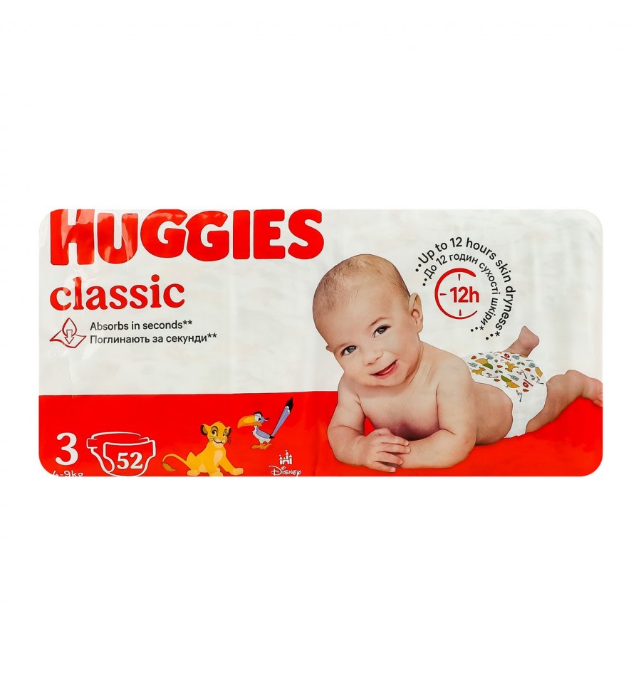 Подгузники Huggies Classic размер 3 52 шт. Подгузники плотно прилегают и не сползают во время активных игр. Подгузники Huggies Classic имеют немало преимуществ: удобная посадка и прочные липучки. Сделаны из приятного на ощупь, щекотливого материала. Удерживают влагу до 12 часов. Даже во время активного времяпрепровождения не протекают, благодаря технологии 360°. Жидкость равномерно распределяется по всей длине, что предотвращает провисание. Есть эластичный пояс, который не давит на животик. Красочный дизайн с милыми рисунками. Состав: суперабсорбент (полиакрилат натрия), древесная целлюлоза, полипропилен, полиэтилен, полиэстер, полиуретан, клеи, красители. Срок годности – 3 года. Хранить при температуре от +5 ° С до +30 ° С в сухом месте. Производитель: Kimberly-Clark Corporation, регистрация США. Импортер: ООО "Кимберли Кларк Украина". Страна производитель: Чехия, Яромеж. Адрес производства: ул. Долечка 111, 551 01, г. Яромер, Чешская Республика. Страна производства: Чехия. Масса нетто: 5528г.