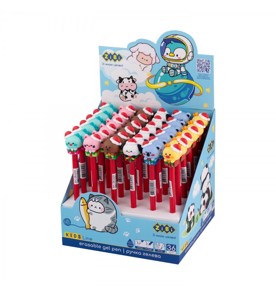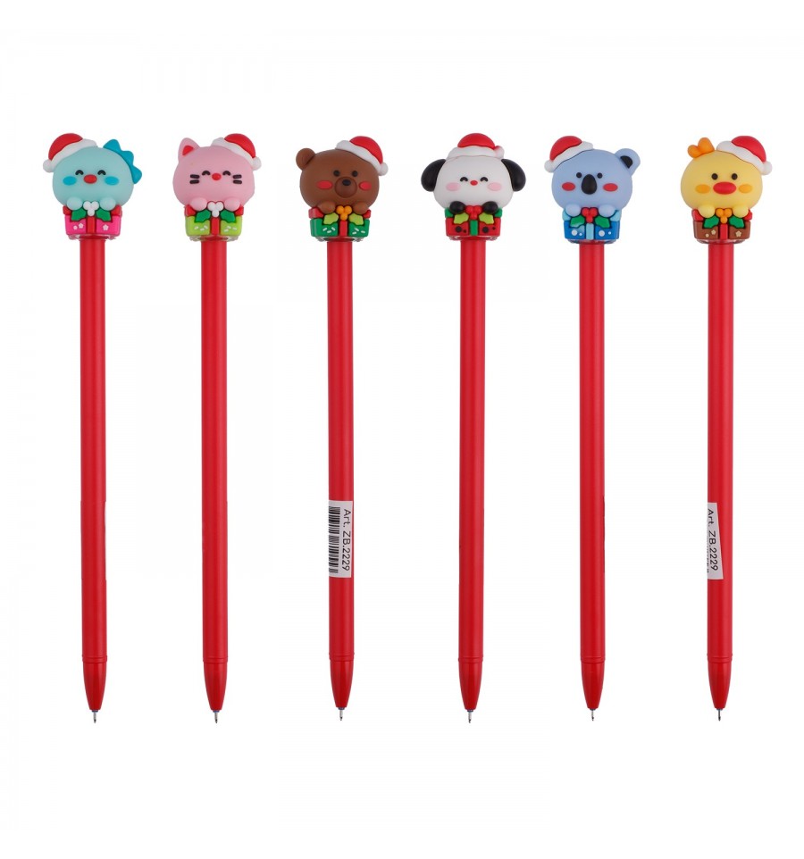 Гелевая ручка «Пиши-стирай» CHRISTMAS от ZiBi – имеет главную особенность, ее надписи можно стирать! Сделать это легко, благодаря специальным чернилам ручки и резинке, расположенной на конце ручки. Просто потрите место, которое нужно поправить, резинкой на ручке. Место нагреется вследствие трения, а чернила – исчезнут из бумаги. Все очень просто, и никакого вреда бумаги в месте трения!Колпачок ручки выполнен в форме фигурок в новогодне-рождественской тематике, из тактильно приятного материала, который не оставит равнодушными ни мальчиков, ни девушек!Сочетание особенности стирания чернил и стильных корпусов – делает ручки CHRISTMAS прекрасным подарочком к зимним праздникам и любимым функциональным помощником школьников, студентов, а также творческих и креативных людей для использования в обучении, ведении дневников, записи новых идей и планов.толщина линии 0.5 мм цвет чернил: синий чернила на гелевой основе сделают письмо очень легкими, мягкими и плавными, без лишних усилий и нажатий. круглая форма корпуса оптимального диаметра, удобная для длительного письма резинка не стирается со временем съемный колпачок позволяет закрыть пишущий наконечник и предотвратить повреждение ручки, а также загрязнение чернилами соседних с ручкой вещей. сменный стержень длиной 130 мм (подходит стержень ВМ.8076-01, ВМ.8076-02, ZB.2502-01) материал корпуса: матовый пластик ассорти цветов упаковка: картонный шоу-бокс, содержащий 36 ручек в шести дизайнах.