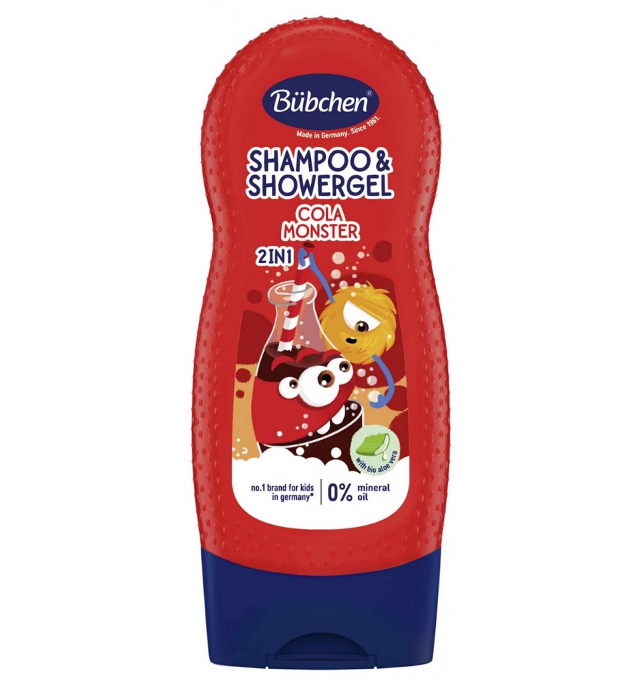 Шампунь и гель для душа Cola Monster 2 в 1. Нейтральный pH для кожи и сохраняет естественный защитный барьер нежной детской кожи. Для ежедневного ухода за кожей и волосами. Без спутывания волос, без разрывов. Состав: вода, лауретсульфат натрия, динатрия лаурет сульфосукцинат, кокамидопропилбетаин, глицерин, хлорид натрия, гидролизованный протеин пшеницы, порошок сока листьев алоэ вера, лаурил лактат, гликоль дистеарат, лаорет-4, феноксиэтанол, бензоат натрия, цитрат натрия, лимонная кислота, парфюмерная композиция, лимонен, цитраль. Нанесите несколько капель шампуня и геля для душа на ладонь, вспените с небольшим количеством воды и распределите по волосам и телу. Тщательно смойте чистой теплой водой. С алоэ вера. с протеинами пшеницы. компонентами моющего средства на растительной основе без парабенов. Сохранять при температуре +4°С до +25° С. Срок годности: 940 дней от даты производства. Производственные мощности: Bubchen Werk Ewald Hermes Pharmazeutische Fabrik GmbH. Владелец бренда: Katjes Gruppe. Германия. Адрес производственных мощностей: Коэстервег, 37, Зост, Германия, 59494.