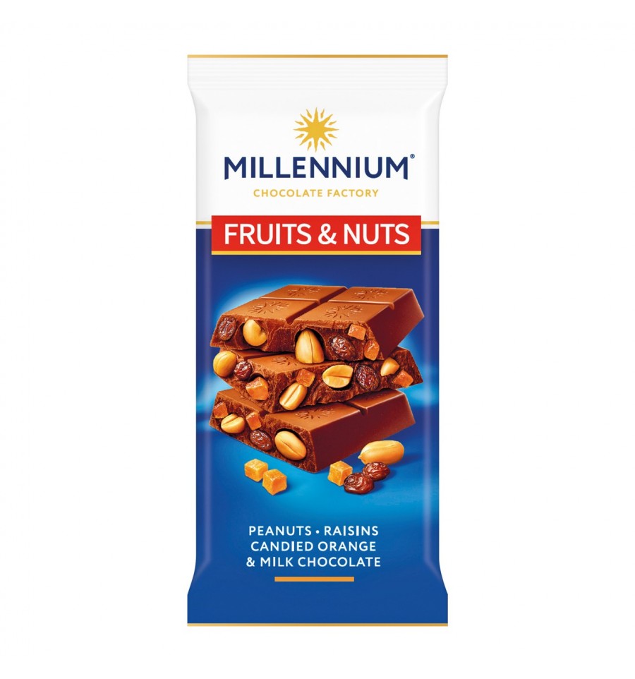 Шоколад Millennium Fruits&Nuts молочный с арахисом, цукатами, изюмом и миндалем 90г. Состав: шоколад молочный [сахар, какао – масло, молоко цельное сухое, какао тертое, сыворотка молочная сухая, жир молочный, эмульгатор лецитин соевый, соль поваренная, ароматизатор ванилин]; арахис жареный 12%, апельсиновые цукаты 7%, изюм 6%, миндаль измельченный 2%, масло апельсина. Аллергены: МОЛОКО, АРАХИС, МИНДАЛЬ, СОЯ. Может содержать следы ГОРЕХОВ (фундук, кешью) злаков, содержащих ГЛЮТЕН. Энергетическая ценность на 100 г продукта: 526 ккал / 2195 кДж, жиры – 30 г, насыщенные жиры – 15 г, углеводы – 53 г, сахара – 48 г, белки – 8,4 г, соль – 0,2 г. Срок годности: 13 месяцев. Хранить при температуре от 15 до 24 °С и относительной влажности воздуха не более 75 %. Производитель: ООО «МАЛБИ ФУДС». Производитель является оператором рынка пищевых товаров. Адрес мощностей производства: ул. Марии Кюри, 5, г. Днепр, 49010, Украина. Тел. +38(056)7945505, 7946505. Страна: Украина. Масса нетто: 90 г(г). Допустимый отрицательный отклонение 4,5 g (г).