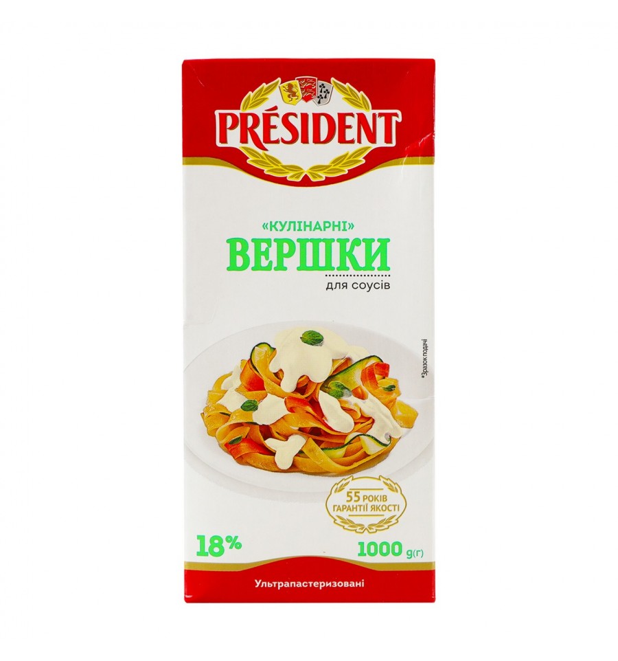 Сливки President Кулинарные для соусов ультрапастеризованные 18% 1000г. Состав: сливки нормализованные, модифицированный крахмал кукурузный, эмульгатор (эфир диацетилвинной кислоты монодиглицеридов), стабилизаторы: пектин, каррагинан. Энергетическая ценность продукта: 794кДж/100г, 192ккал/100г. Питательная (пищевая) ценность продукта: белки – 2.6г/100г, жиры – 18г/100г, насыщенные жиры – 11.7г/100г, углеводы – 4.9г/100г, из них сахара – 3.8г/100г, соль – 0. Массовая доля жира: 18%. Рекомендуемый способ приготовления/употребления: для кулинарных шедевров. Перед использованием взболтать. Условия хранения: хранить при температуре +1..+25ºC. Сухое место без попадания прямых солнечных лучей. Срок годности: 6 месяцев. Температура хранения после открытия продукта: хранить при температуре +4 (+/-2)ºC. Страна изготовитель: Украина. Производственные мощности и адрес производственных мощностей ООО Молочный Дом, ул. Харьковская, 1-в, г. Павлоград, Днепропетровская обл., Украина, 51400. Масса нетто: 1000г.