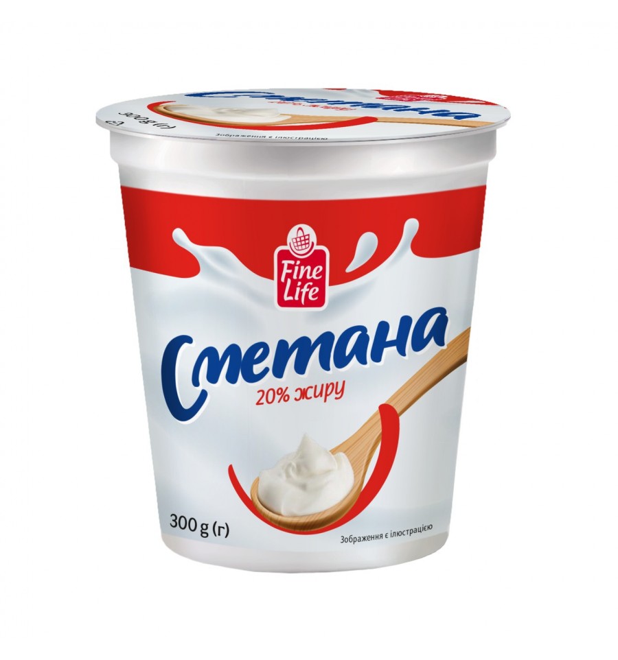 Сметана Fine Life 20% 300г. Пастеризованные сливки из коровьего молока, закваска чистых культур молочнокислых бактерий. Энергетическая ценность продукта: 839кДж/100г, 203ккал/100г. Питательная (пищевая) ценность продукта: белки – 2.7г/100г, жиры – 20г/100г, насыщенные жиры – 12.6г/100г, углеводы – 3.1г/100г, из них сахара – 3.1г/100г, соль – 0. Массовая доля жира: 20%. Условия хранения: хранить при температуре 0..+6ºC и относительной влажности воздуха не более 80%. Срок годности: 24 дня. Срок годности после вскрытия продукта: 18 часов. Страна изготовитель: Украина. Производитель: ЧАО Тернопольский молокозавод. Адрес производственных мощностей: ул. Лозовецкая, 28, г. Тернополь, Украина, 46010. Масса нетто: 300г.