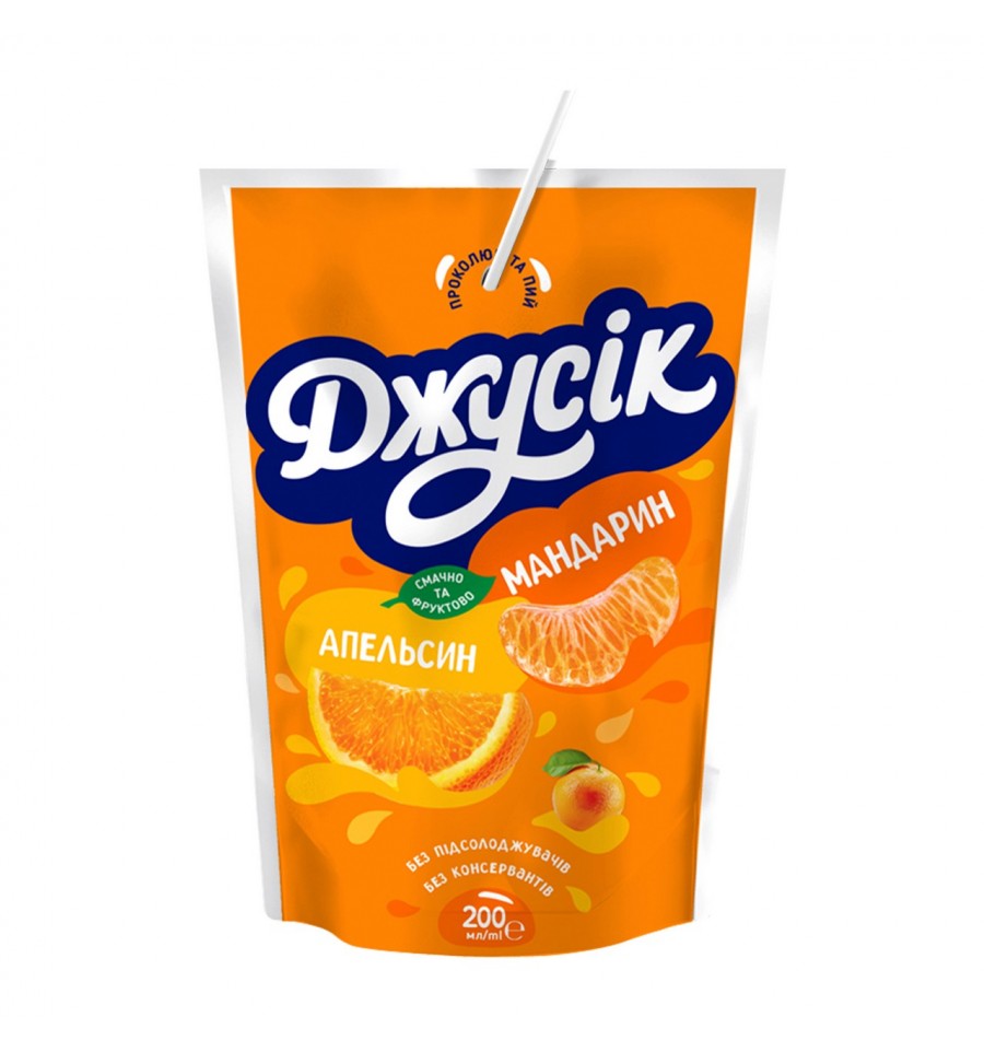 Напиток Джусик Апельсиново-мандариновый DP 0,2л. "Джусик" - это твой краш в мире напитков! Это топчик для всех, кто не любит ждать и кайфует от каждого момента. Натуральные яркие вкусы без лишних добавок, хайповая упаковка и яркие эмоции с каждым глотком – это напитки с соком «Джусик»! Состав: вода питьевая артезианская, сахар, сок апельсиновый концентрированный (5%)*, сок мандариновый концентрированный (5%)*, глюкозно-фруктозный сироп, регуляторы кислотности лимонная кислота, цитрат калия, натуральный ароматизатор, стабилизатор консистенции - гуаровая камедь. * массовая доля соков указана в пересчете на восстановленный продукт. Энергетическая ценность на 100 мл продукта: 37 ккал /155 кДж, жиры - 0 г, насыщенные жиры - 0 г, углеводы - 9,0 г, сахара - 8,1 г, белки - 0,07 г, соль - 0,01 г. Срок годности: 365 Хранить при температуре от 0 до +25 °С. После открывания пакета хранить при температуре от +2°С до +6°С, продукт употребить в течение суток. Перед употреблением взболтать. Производитель: СП "Витмарк-Украина" ООО, ул. Мира, 144, с. Степановка, Раздельнянский р-н, Одесская обл., 67430, Украина. Производитель: СП "Витмарк-Украина" ООО, ул. Мира, 144, с. Степановка, Раздельнянский р-н, Одесская обл., 67430, Украина. Страна: Украина. Объем: 200 мл