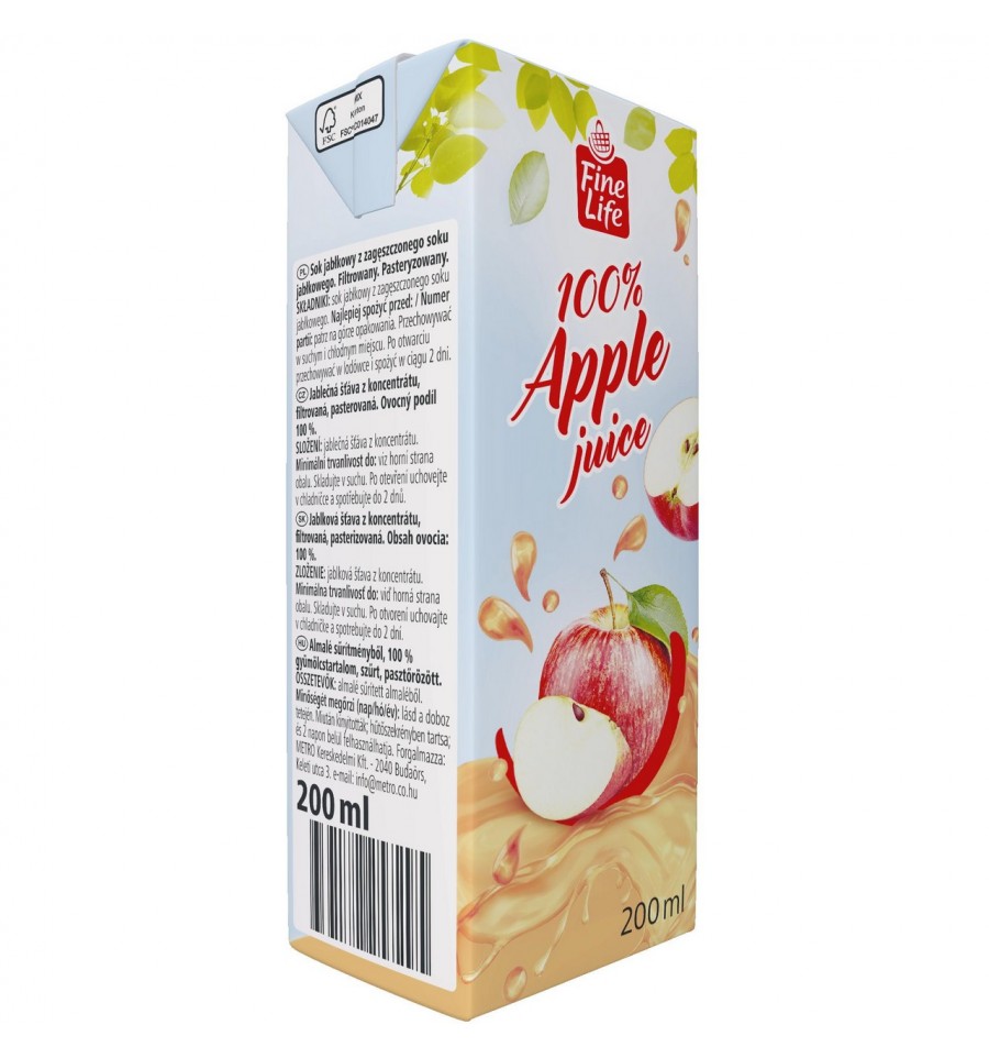 Сок яблочный, восстановленный из концентрата, отфильтрованный, пастеризованный ТМ "Fine Life". Состав: яблочный сок, восстановленный из концентрата яблочного сока 100%. Энергетическая ценность на 100 мл: 199 кДж/47 ккал, жиры – 0 г, из них насыщены – 0 г, углеводы – 11,4 г, из них сахара – 11,4 г, белки – 0 г, соль – 0,03 г. Дата «Лучшее употребление в» и номер партии Условия хранения хранить в прохладном, темном месте. После открытия хранить в холодильнике и употребить в течение 2 суток. Производитель: Szobi Italgyártó Kft, Ady Endre utca 22., 2628 Szob, Венгрия. Изготовлен в Венгрии. Импортер: ООО "МЕТРО Кэш энд Керри Украина", просп. Григоренко, 43, г. Киев, 02140, Украина. По вопросам продукта обращайтесь по тел. горячей линии импортера: 0800 501 401 (бесплатно в пределах Украины). Масса нетто: 200 мл