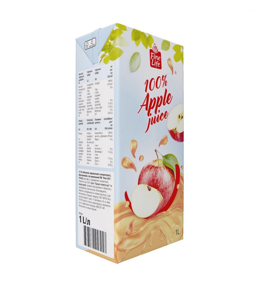 Сок яблочный, восстановленный из концентрата, отфильтрованный, пастеризованный ТМ "Fine Life". Состав: яблочный сок, восстановленный из концентрата яблочного сока 100%. Энергетическая ценность на 100 мл: 199 кДж/47 ккал, жиры – 0 г, из них насыщены – 0 г, углеводы – 11,4 г, из них сахара – 11,4 г, белки – 0 г, соль – 0,03 г. Дата «Лучшее употребление в» и номер партии Условия хранения хранить в прохладном, темном месте. После открытия хранить в холодильнике и употребить в течение 2 суток. Производитель: Szobi Italgyártó Kft, Ady Endre utca 22., 2628 Szob, Венгрия. Изготовлен в Венгрии. Импортер: ООО "МЕТРО Кэш энд Керри Украина", просп. Григоренко, 43, г. Киев, 02140, Украина. По вопросам продукта обращайтесь по тел. горячей линии импортера: 0800 501 401 (бесплатно в пределах Украины). Масса нетто: 1 л