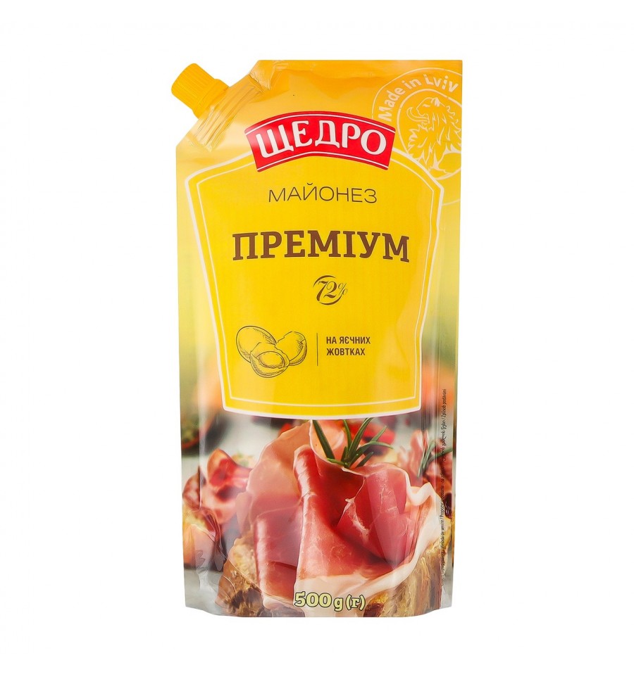 Майонез Щедро Премиум 72% 500г. Состав: масло подсолнечное рафинированное дезодорированное 71.5%, вода питьевая, сахар, желток яичный ферментированный жидкий 2.2%, уксус спиртовый, соль поваренная, регулятор кислотности кислота молочная, консервант сорбат калия, ароматизатор Е385, краситель бета-каротин. Энергетическая ценность продукта: 2724кДж/100г, 662ккал/100г. Питательная (пищевая) ценность продукта: белки – <0.5г/100г, жиры – 72г/100г, насыщенные жиры – 8.6г/100г, углеводы – 3.2г/100г, из них сахара – 3г/100г, соль – 0.95. Массовая доля жира: 72%. Условия хранения: хранить при температуре 0..+24ºC и относительной влажности воздуха не более 75%. Без постороннего запаха и попадания прямых солнечных лучей. Срок годности: 4 месяца. Температура хранения после открытия продукта: хранить при температуре 0..+11ºC. Срок годности после вскрытия продукта: 7 дней. Страна изготовитель: Украина. Производственные мощности и адрес производственных мощностей ООО Щедро, ул. Городоцкая, 132, г. Львов, Украина, 79015. Масса нетто: 500г.