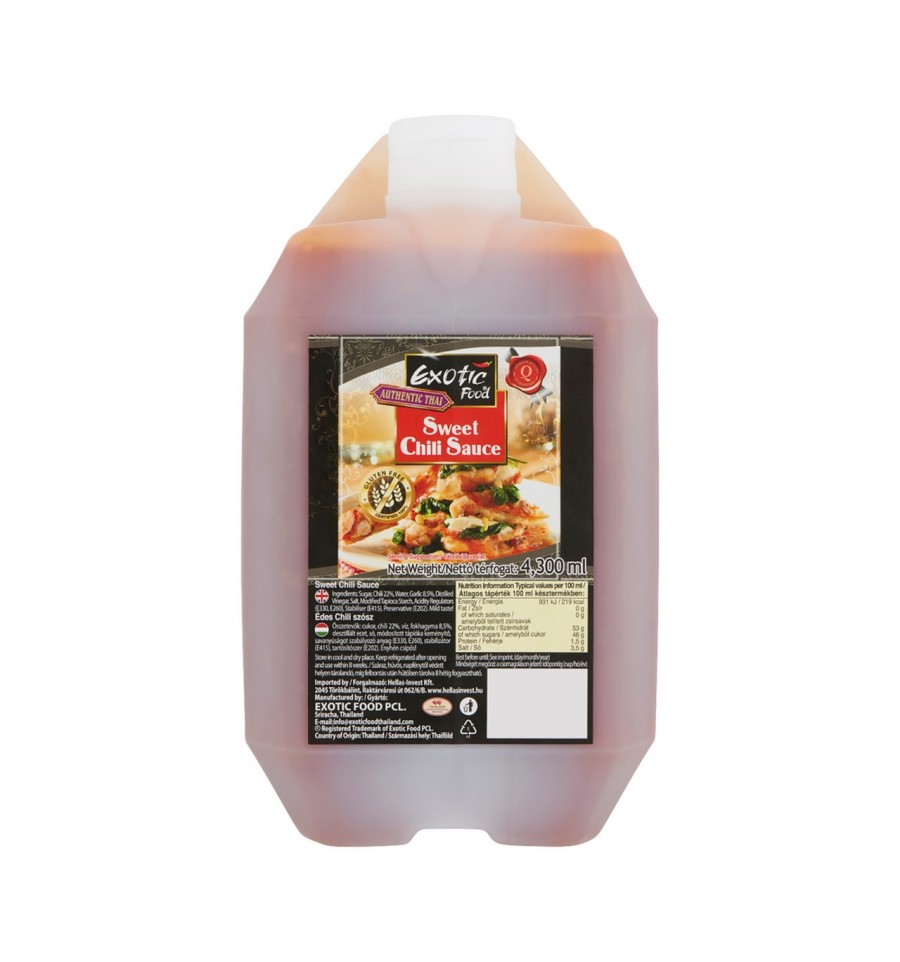 Соус сладкий чили. Пастеризованный продукт. Состав: сахар, перец чили 22%, вода, чеснок 8,5%, уксус спиртовый, соль, крахмал тапиоки, регуляторы кислотности: Е330, Е260, стабилизатор: Е415, консервант: Е202. Питательная ценность на 100 мл продукта Энергетическая ценность 931 кДж/219 ккал. Жиры 0 г. из них насыщены 0 г. Углеводы 53 г. из них сахара 46 г. Белки 1,4 г. Соль 3,5 г. «Лучше употребить в» и номер партии указаны на упаковке. Хранить в прохладном сухом месте. После открывания хранить в холодильнике и применить в течение 8 недель. На упаковке изображены рекомендации по сервировке. Страна происхождения: Таиланд. Импортер: ООО "Метро Кэш энд Керри Украина", 02140, Украина, г. Киев, просп. П. Григоренко, 43. По вопросам продукта обращайтесь по тел.: 0 800 501 401 (бесплатно в пределах Украины). Масса нетто: 5150 г. Объем: 4300 мл