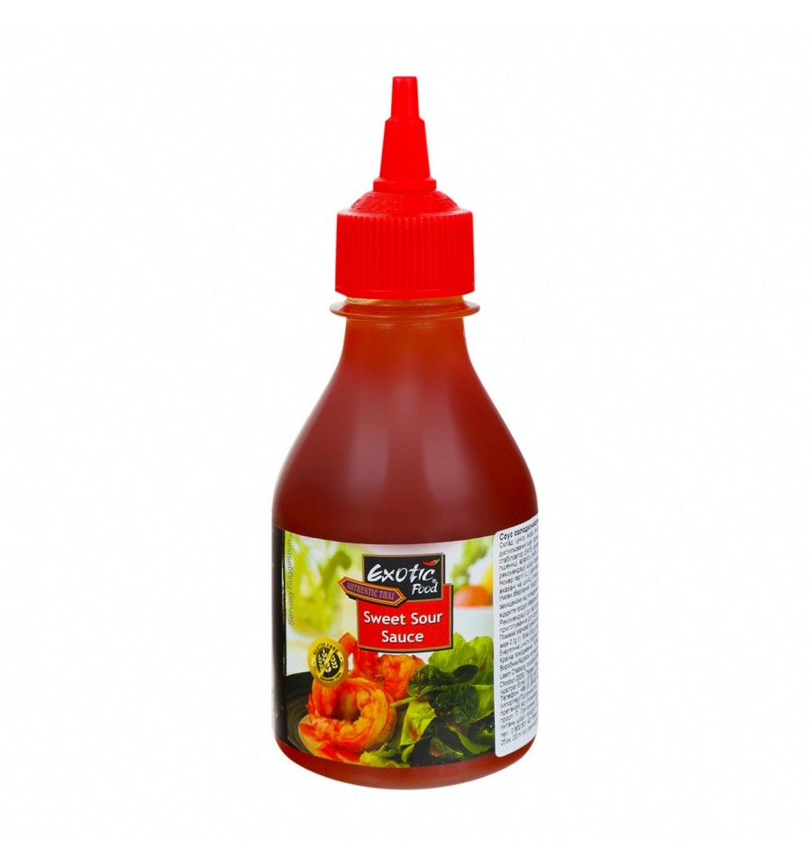 Соус Exotic food сладкокислый пастеризованный 200мл. Состав: сахар, вода, ананасовый сок 20%, томат, чили (перец), дистиллированный уксус, крахмал модифицированный тапиоковый, соль, стабилизатор (Е415), консервант (Е202). Калорийность на 100 мл продукта: 183ккал/777кДж. Питательная ценность на 100мл продукта: белки – 0.8г, жиры – 0.5г, углеводы – 44г. Условия хранения: в сухом прохладном месте, защищенном от попадания прямых солнечных лучей. Срок годности: 2 года. После открытия хранить в холодильнике и использовать в течение 8 недель. Рекомендации по применению: используется для приготовления дип-соусов и соуса стир-фрай. Страна изготовитель: Таиланд. Производитель: Exotic Food Public Co., Ltd. Адрес мощностей производства: Лаем Чабанг Индастриал Эстейт (ЭПЗ2) 49/42 Моо 5, Тунь Сукала, Шрирача, Чонбури, Таиланд, 20230. Объем: 200мл.