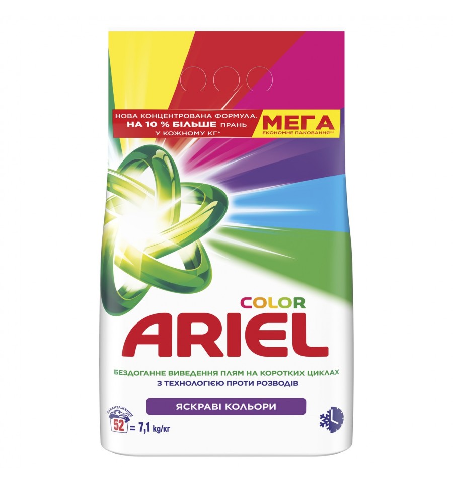 Ariel Средство Колор автомат 5кг. Срок годности – 24 месяцев. Импортер: ООО "Проктер энд Гэмбл Украина". Адрес импортера: ул. Завокзальная, 2, г. Борисполь, Киевская обл., Украина, 08304. Страна: Чехия. Масса нетто: 5 кг.