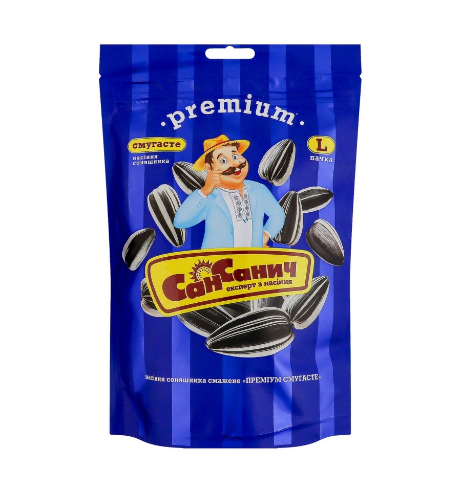 Семена подсолнечника Сан Саныч Премиум полосатые жареные 140г. Состав: семена подсолнечника. Без ГМО. Энергетическая ценность продукта: 2735кДж/100г, 661ккал/100г. Питательная (пищевая) ценность продукта: белки – 25.4г/100г, жиры – 59.8г/100г, насыщенные жиры – 6.9г/100г, углеводы – 5.3г/100г, из них сахара – 3.8г/100г, соль. Рекомендуемые способы применения: продукт полностью готов к потреблению без дополнительной подготовки. Условия хранения: хранить при температуре не выше +25ºC и относительной влажности воздуха не более 75%. Хорошо вентилируемое место без попадания прямых солнечных лучей. Меры предосторожности: внутри содержится пакетик с поглотителем кислорода. Не есть! Не разрывать. Срок годности: 9 месяцев. Страна изготовитель: Украина. Производитель и адрес производителя: ООО Снек Продакшн, просп. Александра Поля, дом. 103, каб. 205, г. Днепр, Днепропетровская обл., Украина, 49069. Адрес производственных мощностей: ул. Василия Стуса, 54в, г. Павлоград, Днепропетровская обл., Украина, 51400. Масса нетто: 140г.