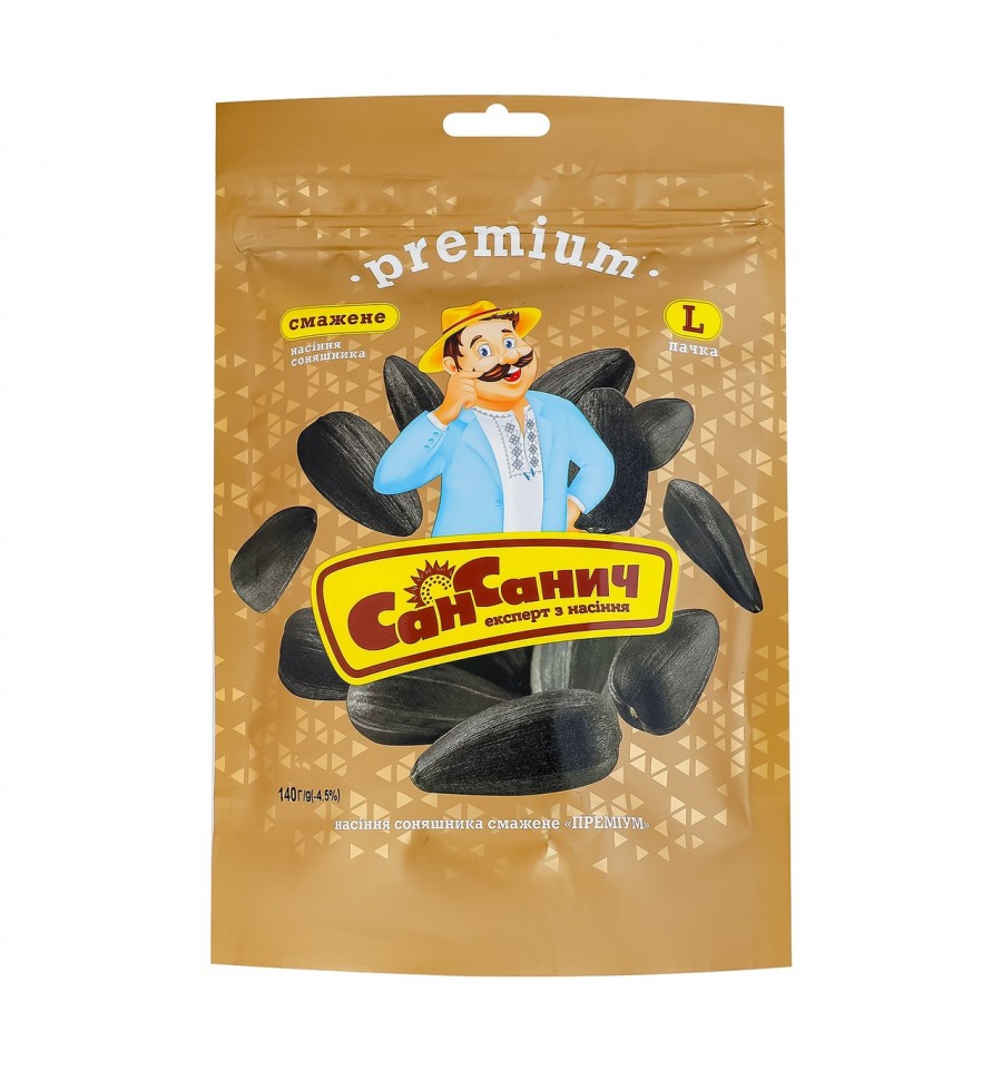Семена подсолнечника Сан Саныч Премиум L жареные 140г. Состав: семена подсолнечника. Без ГМО. Энергетическая ценность продукта: 2735кДж/100г, 661ккал/100г. Питательная (пищевая) ценность продукта: белки – 25.4г/100г, жиры – 59.8г/100г, насыщенные жиры – 6.9г/100г, углеводы – 5.3г/100г, из них сахара – 3.8г/100г, соль. Рекомендуемые способы применения: продукт полностью готов к потреблению без дополнительной подготовки. Условия хранения: хранить при температуре не выше +25ºC и относительной влажности воздуха не более 75%. Без попадания прямых солнечных лучей. Меры предосторожности: внимание! Внутри помещается пакетик с поглотителем кислорода. Не есть! Не разрывать. Срок годности: 1 год. Страна изготовитель: Украина. Производитель и адрес производителя: ООО Снек Продакшн, просп. Александра Поля, дом. 103, каб. 205, г. Днепр, Днепропетровская обл., Украина, 49069. Адрес производственных мощностей: ул. Василия Стуса, 54 в, г. Павлоград, Днепропетровская обл., Украина, 51400. Масса нетто: 140г.