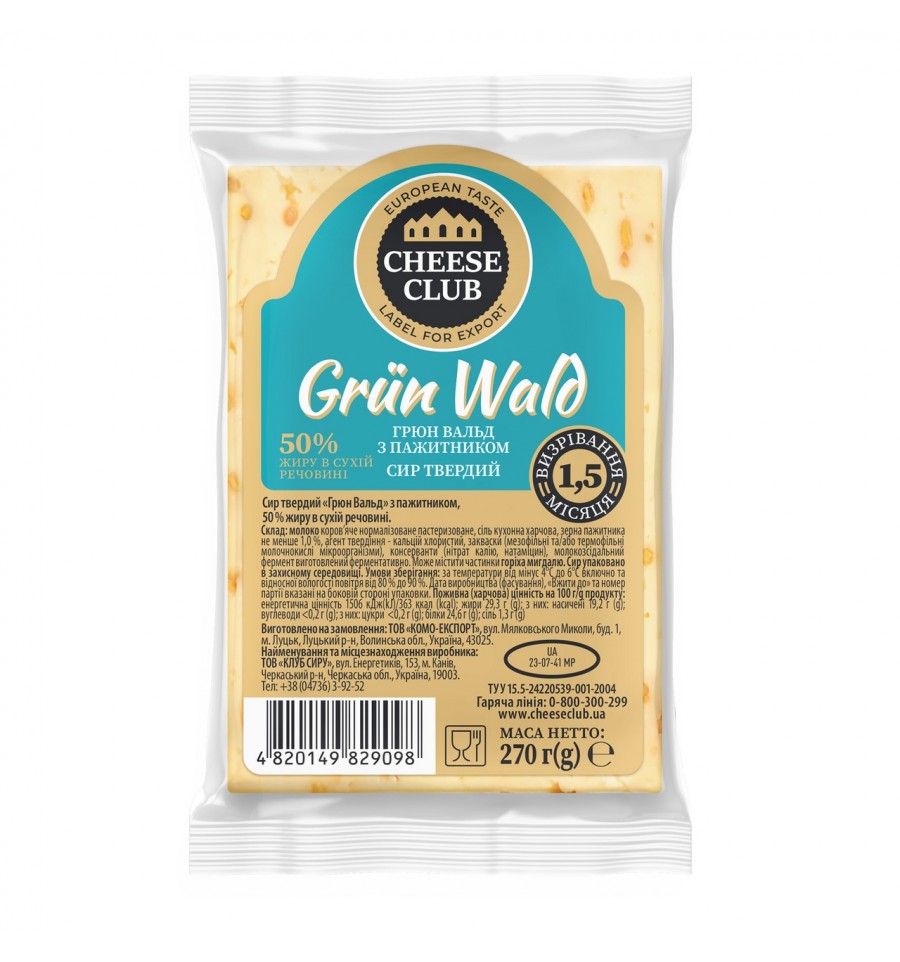 Сыр твердый "Грюн Вальд" с пажитником 50% в сухом веществе, брусок 270 г. Состав: молоко коровье нормализованное пастеризованное, соль поваренная пищевая, зерна пажитника не менее 1,0 %, агент твердения - кальций хлористый, закваски (мезофильные и молочные) (нитрат калия, натамицин), молокосвертывающий фермент изготовлен ферментативно. Может содержать частицы ореха миндаля. Калорийность в 100г продукта: 1506 кДж (KJ)/363 ккал (kcal). Пищевая ценность в 100 г продукта: жиры –29,3 г (g), из них насыщены –19,2 г (g); углеводы – <0,2 г (g) из них сахара – <0,2 г (g); белки –24,6 г (g); соль –1,3 г (g). Условия хранения и сроки годности: хранить при температуре от -4°С до 6°С и относительной влажности воздуха от 80 до 90%. Срок годности сыров фасованных с момента открывания герметичной упаковки при температуре хранения не выше 6°С и относительной влажности воздуха от 80% до 90% включительно не более 5 суток, плотно завернутым в пленку, разрешенную для контакта с пищевыми продуктами центральным органом власти в сфере государственного надзора за соблюдением. Производитель: ООО "КЛУБ СЫРА". Страна производства: Украина. Адрес производственных мощностей: ул. Энергетиков, 153, г. Канев, Черкасский р-н, Черкасская обл., Украина, 19003 Тел: +38 (04736) 3-92-52. Эксплуатационное разрешение: 23-07-41 МГ. Содержимое ГМО: не содержит указанного вещества. Масса нетто: 270 г. Срок годности: 120 суток.