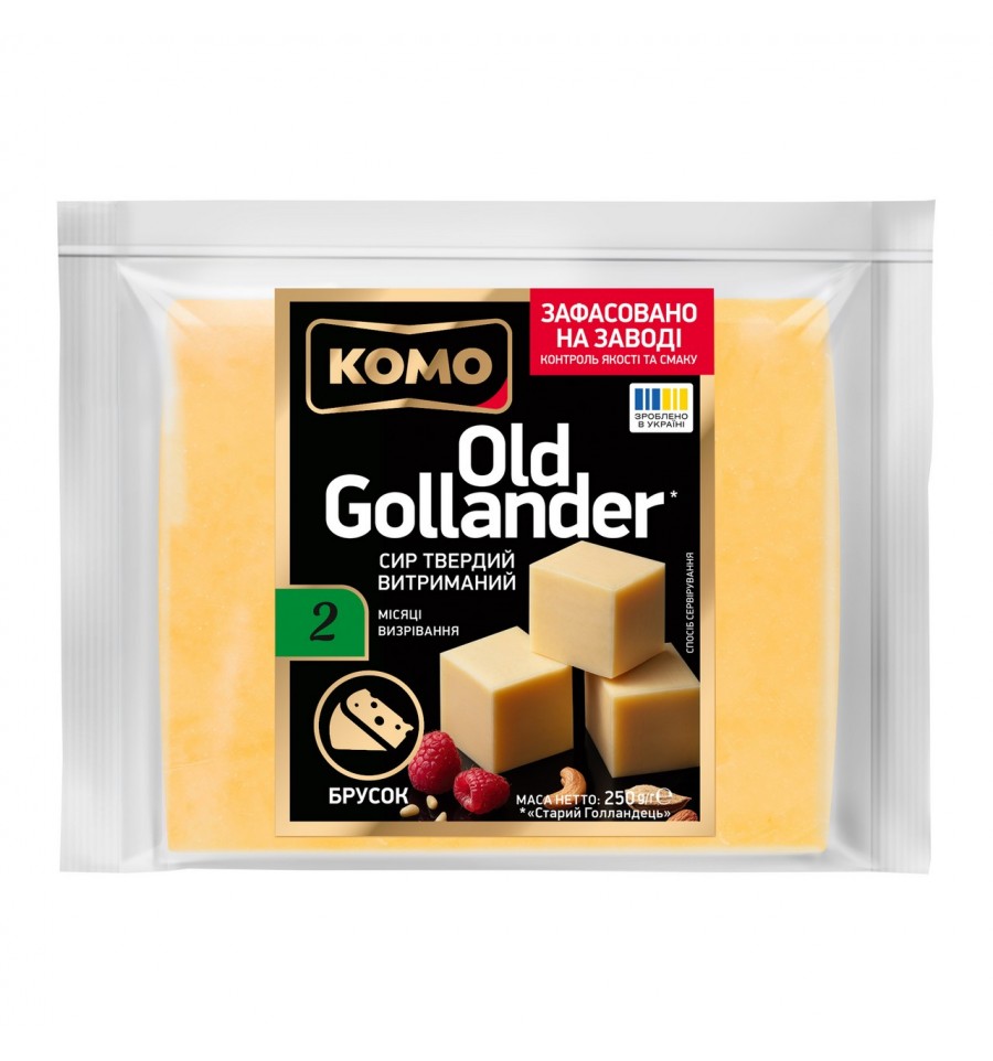 Сыр твердый Старый Голландец, 45% жира в сухом веществе, 2 месяца созревания, брусок 250 г. Состав: молоко коровье нормализованное пастеризованное (молоко коровье цельное, молоко коровье обезжиренное), соль поваренная, азотнокислый, с использованием заквашивающих препаратов (мезофильные и термофильные молочнокислые бактерии) и молокосвертывающего ферментного препарата микробиального происхождения (химозин). Может содержать частицы орехов. Калорийность в 100г продукта: 362 ккал (1503 кДж). Пищевая ценность в 100 г продукта: жиры – 28 г, из них насыщенные – 18 г; углеводы – 1,0 г, из них сахара – 1,0 г; белки – 27 г; соль – 1,3 г. Условия хранения и сроки годности: при температуре от 0°С до 6°С и относительной влажности воздуха 80-90% не более 120 суток. Производитель: ЧАО «Дубномолоко». Страна производства: Украина. Адрес производственных мощностей: Ул. Грушевского, 117-А, г. Дубно, Ровенская обл., 35602. Эксплуатационное разрешение: a-UA-17-17-04-IX-PP. Содержимое ГМО: не содержит указанного вещества. Масса нетто: 250 г.