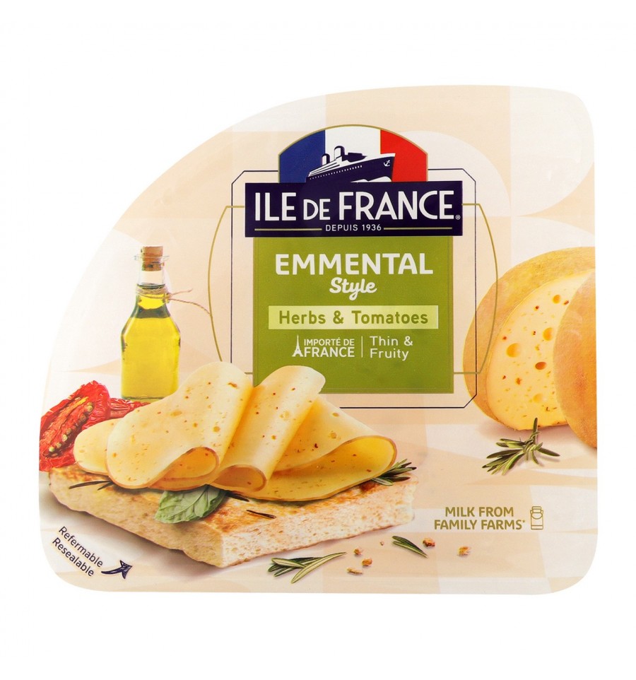 Сыр полутвердый Ile De France Эмменталь с травами и томатами 150г. Состав: молоко коровье пастеризованное, томаты сушеные, соль поваренная, сыворотка молочная сухая (молоко), оливковое масло, прованские травы, чеснок, пряности, молочные культуры, ферментный препарат, натуральные ароматизаторы, красители (в корке): бета-каротин, карамель Энергетическая ценность продукта: 352кДж/100г. Питательная (пищевая) ценность продукта: белки – 25г/100г, жиры – 28г/100г, насыщенные жиры – 19г/100г, углеводы – <0.5г/100г, из них сахара – <0.5г/100г, соль – 1.4г. Минерализация: кальций (Ca) – 795г/100г, натрий (Na) – 560мг/100г. Условия хранения: хранить при температуре +2...+6ºC. Срок годности: 199 дней. Страна производитель: Франция. Производитель и адрес производителя: Fromagerie Perot, Шато-Гонтье-сюр-Майен, Франция, 53200. Импортер и адрес импортера: ЧАО Звенигородский сыродельный комбинат, ул. Казачанская, 35 А, г. Звенигородка, Звенигородский р-н, Черкасская обл., Украина, 20200. Количество: 7шт. Масса нетто: 150г.