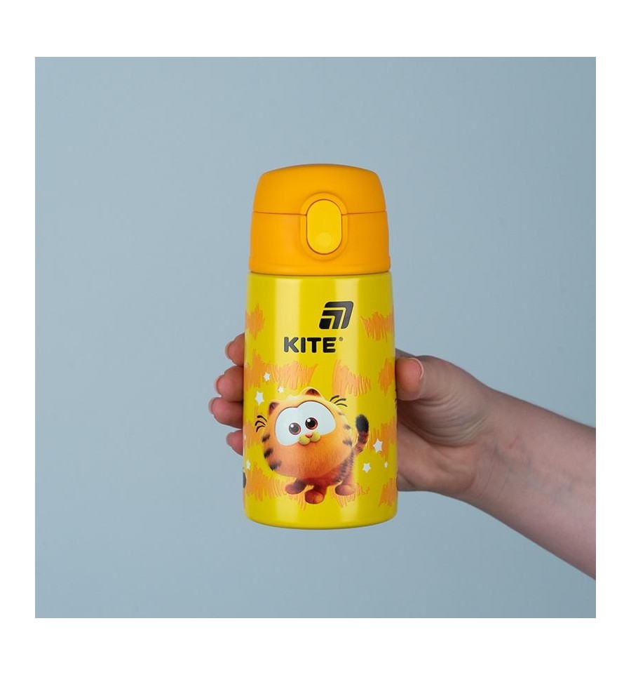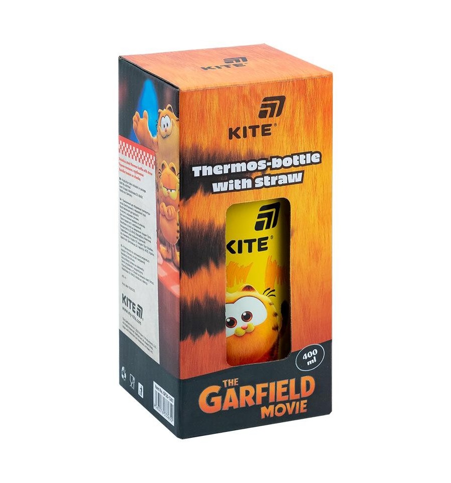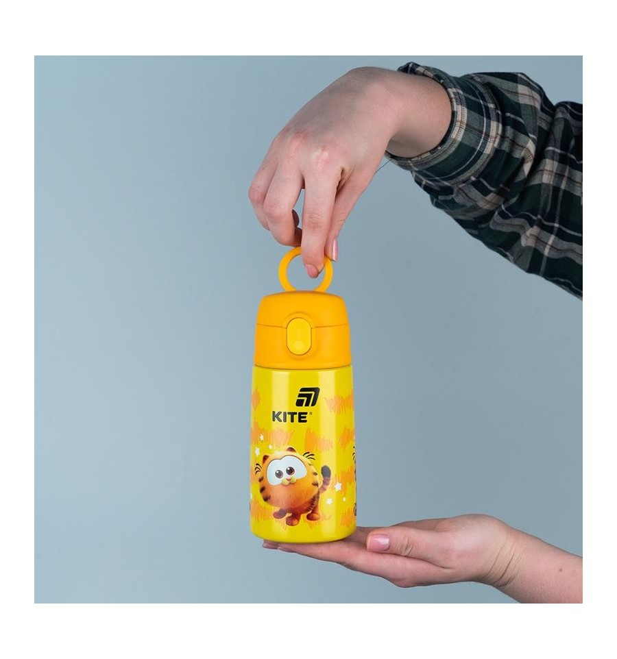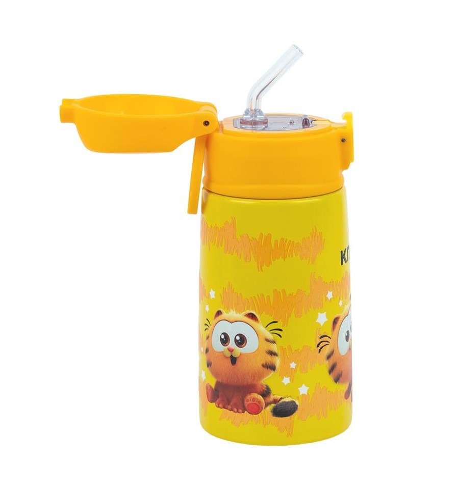 Термос с трубочкой Kite GF25-1261, 400 мл сохранит любимый напиток всегда под рукой и в нужной температуре.Незаменим для прогулок, школы или путешествий. Благодаря силиконовой трубочке, детям удобно пить любимые напитки: чай, какао, компот и т.д.Термос изготовлен из высококачественной нержавеющей стали SS 304, надежно сохраняет температуру напитка до 5 часов, оставляя чай теплым, а лимонад – прохладным. Специальная ручка обеспечивает удобную транспортировку, а герметичная крышка с кнопкой открывается одним движением, защищая от случайного разлива.В комплект входит щеточка для очистки трубочки – чтобы уход за термосом был простым и быстрым.Яркий дизайн в лицензии Garfield подарит хорошее настроение на целый день.Особенности:объем 400 мл - оптимальный для детских напитков; изготовлен из нержавеющей стали SS 304 - безопасный, долговечный, не влияет на вкус; сохраняет температуру напитков до 5 часов; силиконовая трубочка – удобно и гигиенически пить даже детям; в комплекте щеточка для легкой очистки трубочки; кнопка открытия с фиксатором – чтобы быстро открыть, надежно закрыть; удобная ручка – легко носить с собой; яркий дизайн – нравится детям; не рекомендуется мыть в посудомоечной машине. Рекомендация: не наливайте кипяток и подождите несколько минут перед закрыванием крышки во избежание повышения давления от пара.